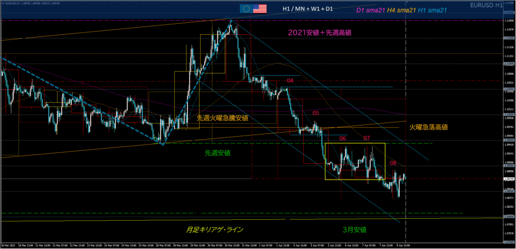 4時間足ベアの視点:日足クラスの戻り売り背景。①2021年安値への上値試しから戻り売り。②先週安値付近サポート崩れで3月安値へショート。