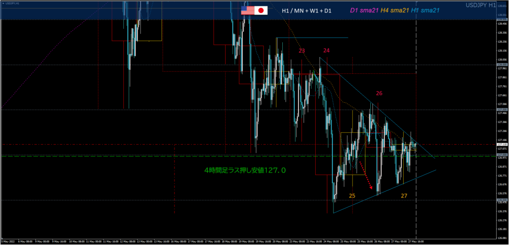 - 4時間ラス押し安値127.0サポートVS.4月高値Wトップ起点の下降トレンド。