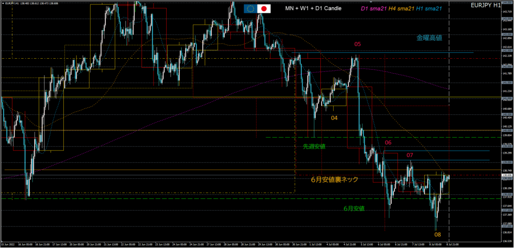 1時間足ブルの視点:①2002年高値付近サポートで6月高値へロング。②火曜高値付近の崩れで6月高値へロング。