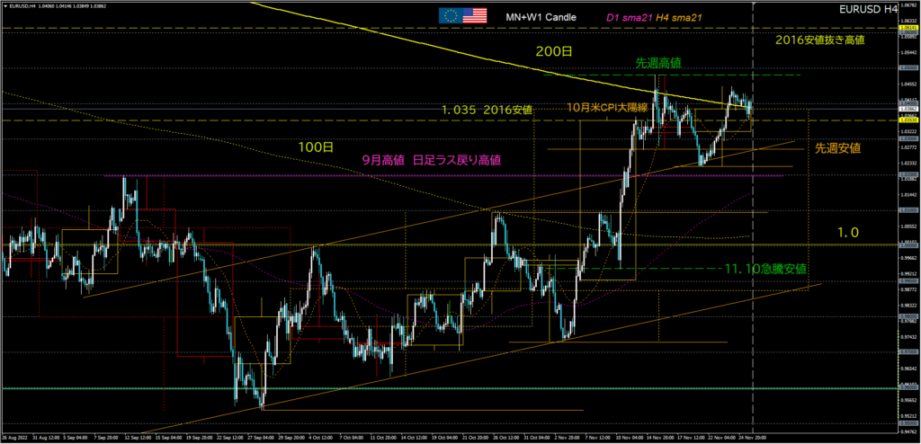 - 22日火曜、11.11付近から10月米CPI大陰線の日足戻り売りが入り始めた。