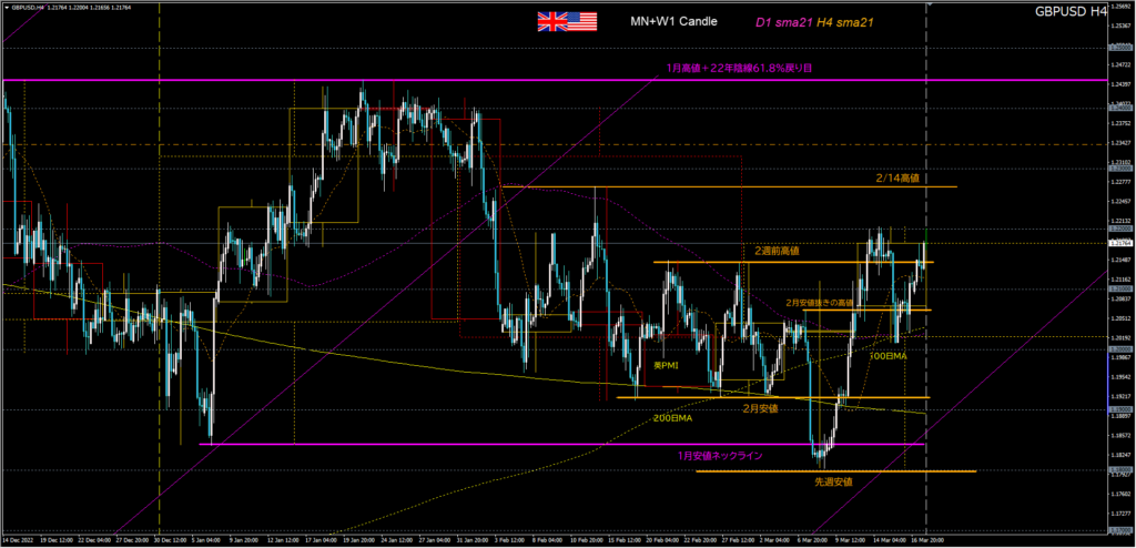 • 22年陽線押し目買いによるブル・トレンドが継続中だが、200日MA+12/20日銀高値付近の抵抗帯と、米2月雇用統計でドルが反落、134.0の4時間レベルの押し安値を強襲。