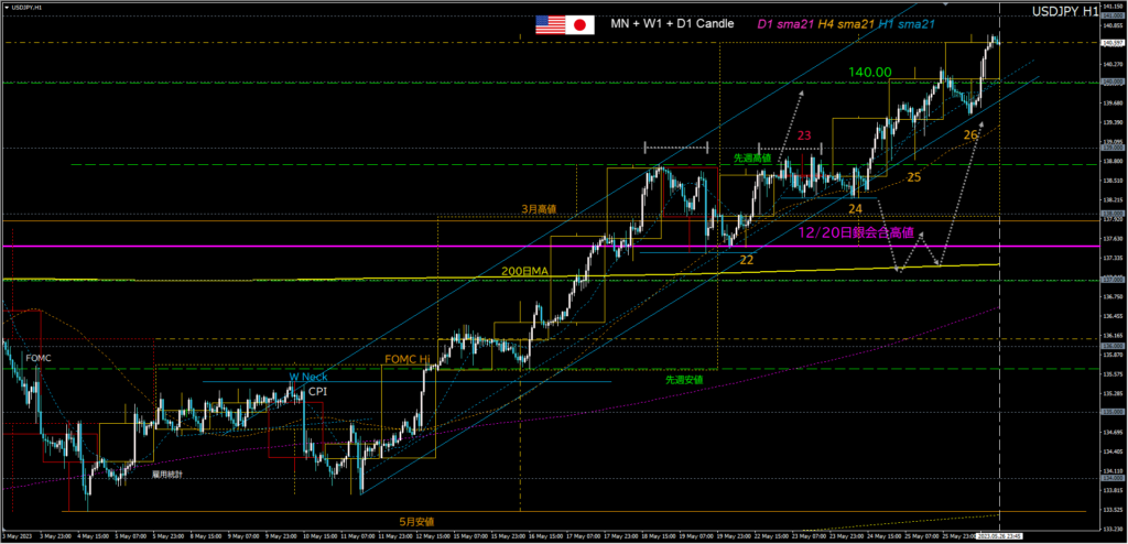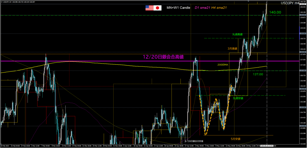 - NY時間、米4月PCEデフレーターで急騰、140.00の2回目サポート(ダマシのリスク回避)で第三波を青1押し目買い、4時間足5本目クローズでアウト。
