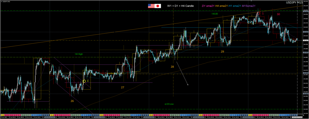 先週高値を火曜陽線が更新後、145.00+4時間チャネル高値まで「電車道」で買われた。