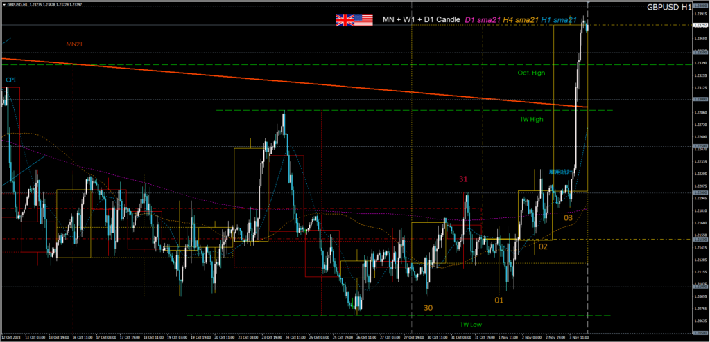 GBPUSD 1時間足に月足+週足+日足ロウソク