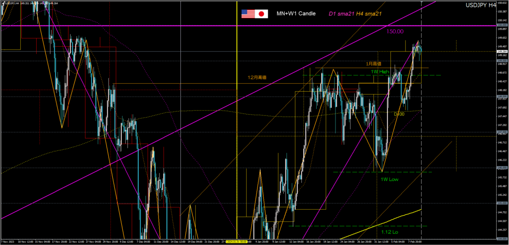 - ロンドン時間、1月高値に到達、3本目の4時間足陽線クローズで半決済、残りは150.00へ向けてホールド。