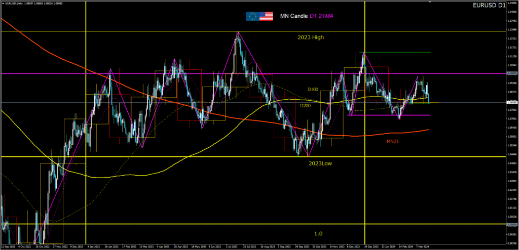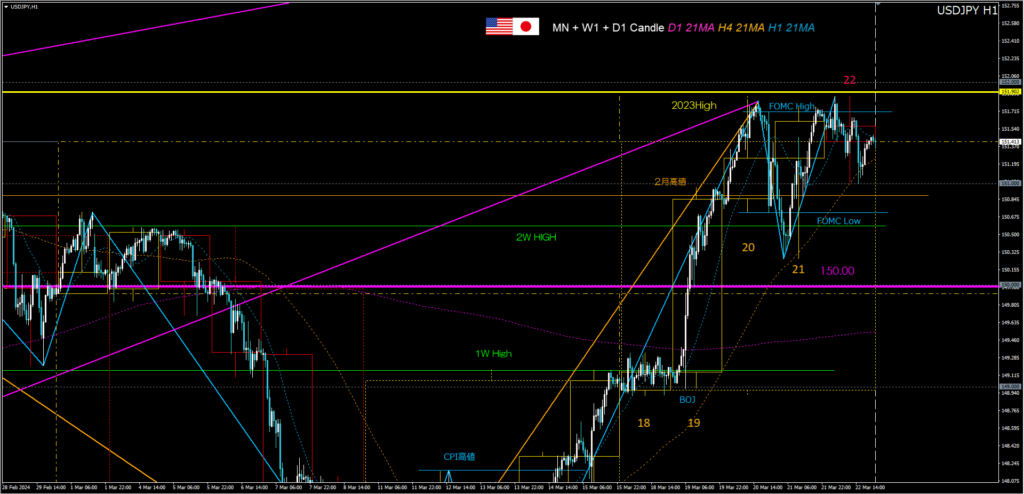 火曜日、日銀のマイナス金利解除の発表でドル急騰して円安になった。木曜日の押し目買いで、2023年高値にMトップを形成中。