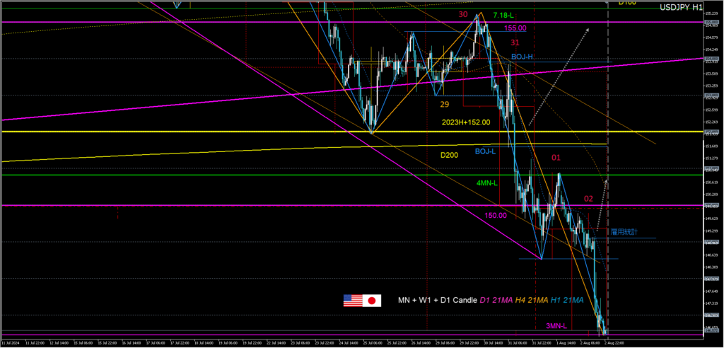 - NY時間、昨日発表された製造業景況指数と新規失業保険申請件数が悪い数字だったことから、雇用統計も悪い数字になり急落。148.00反発、5分足ピンバーの安値抜けで赤1戻り、3月安値でアウト。