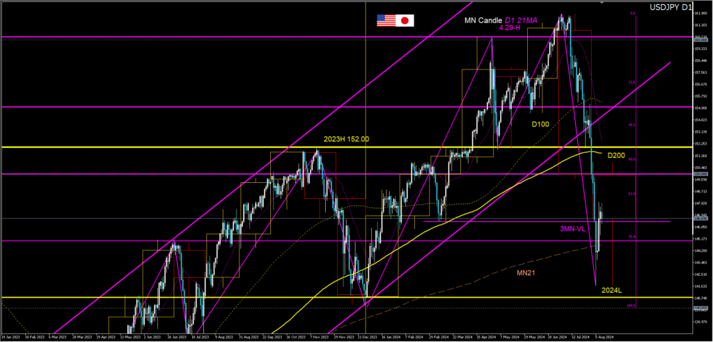 - 2024年安値の100ピプス手前までドル続落後、142.00から145.00へ引き戻された。