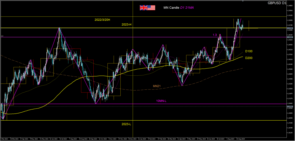 - 2023年高値が意識され、8月陽線は長い上髭。