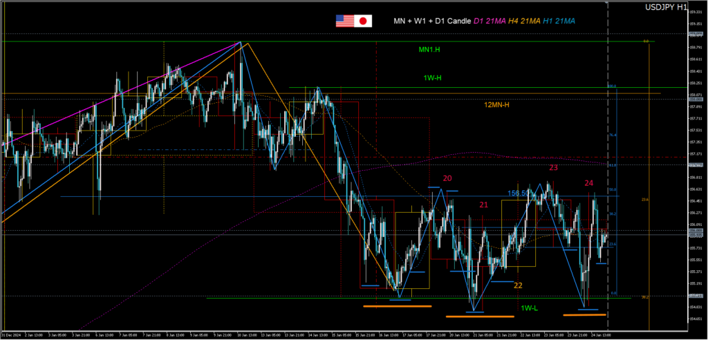 ドル円の大局は上昇相場で、先週はトランプ大統領就任式前のポジション調整で155.00(12月安値上昇波の38.2%ポイント=日足のネックライン候補)まで下落。