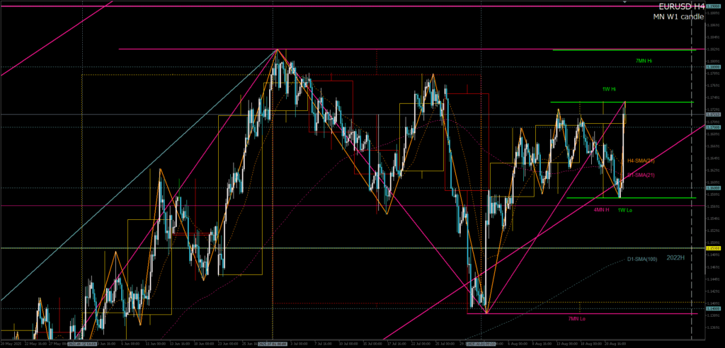 22日の日本時間23時、ジャクソンホール会議においてパウエルFRB議長講演の利下げ示唆発言をきっかけに急落、先週安値のレンジ下限を試した。