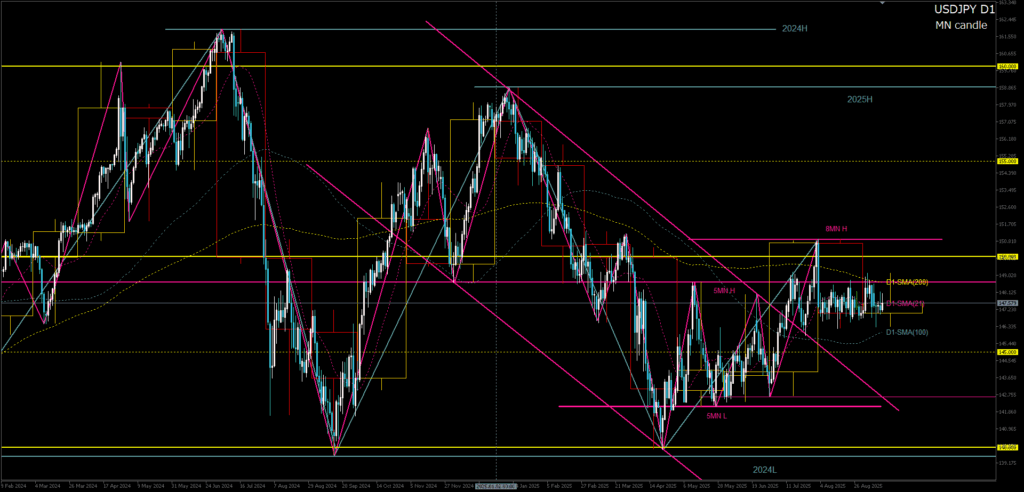 8月安値レンジ下限+100日線のサポートが背景①147.0のサポートで149.0へ押し目買い②8月安値レンジ下限+100日線を試せば148.0へ向けて買う