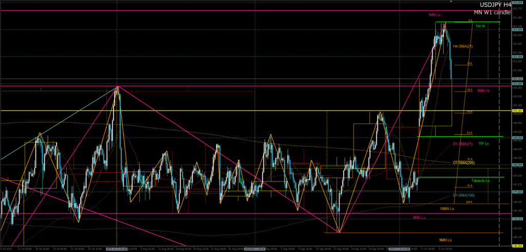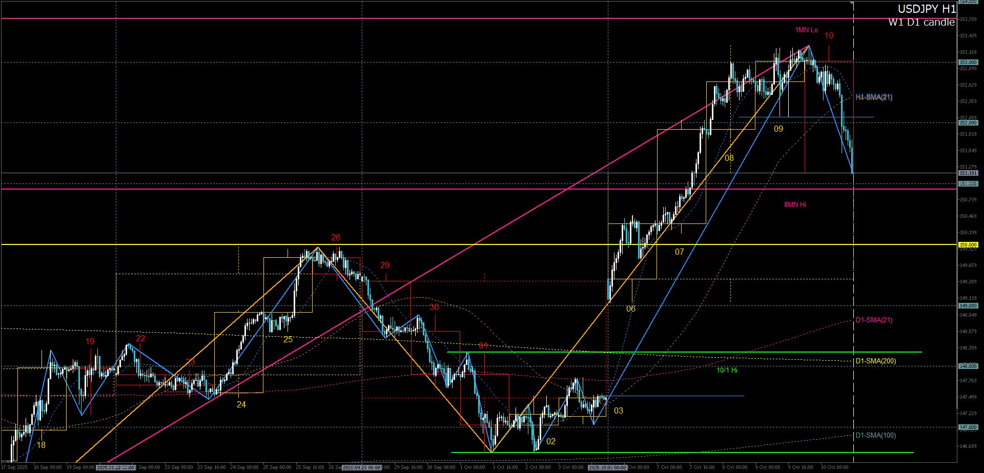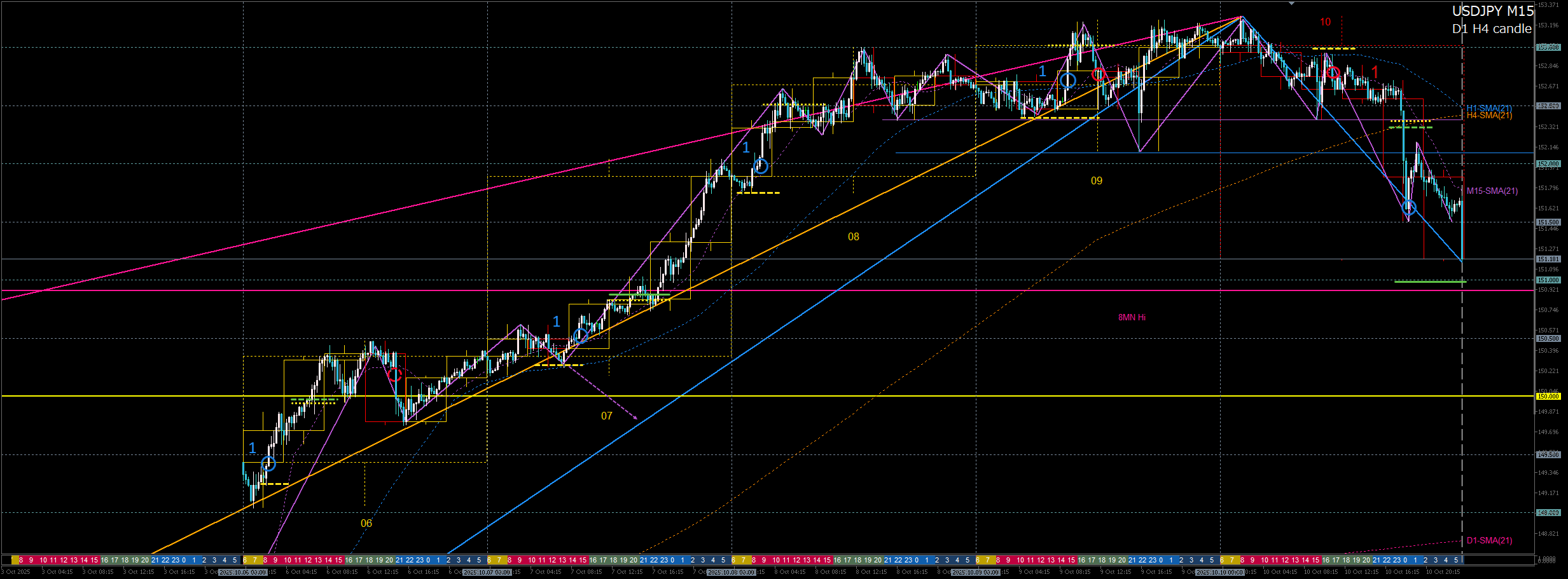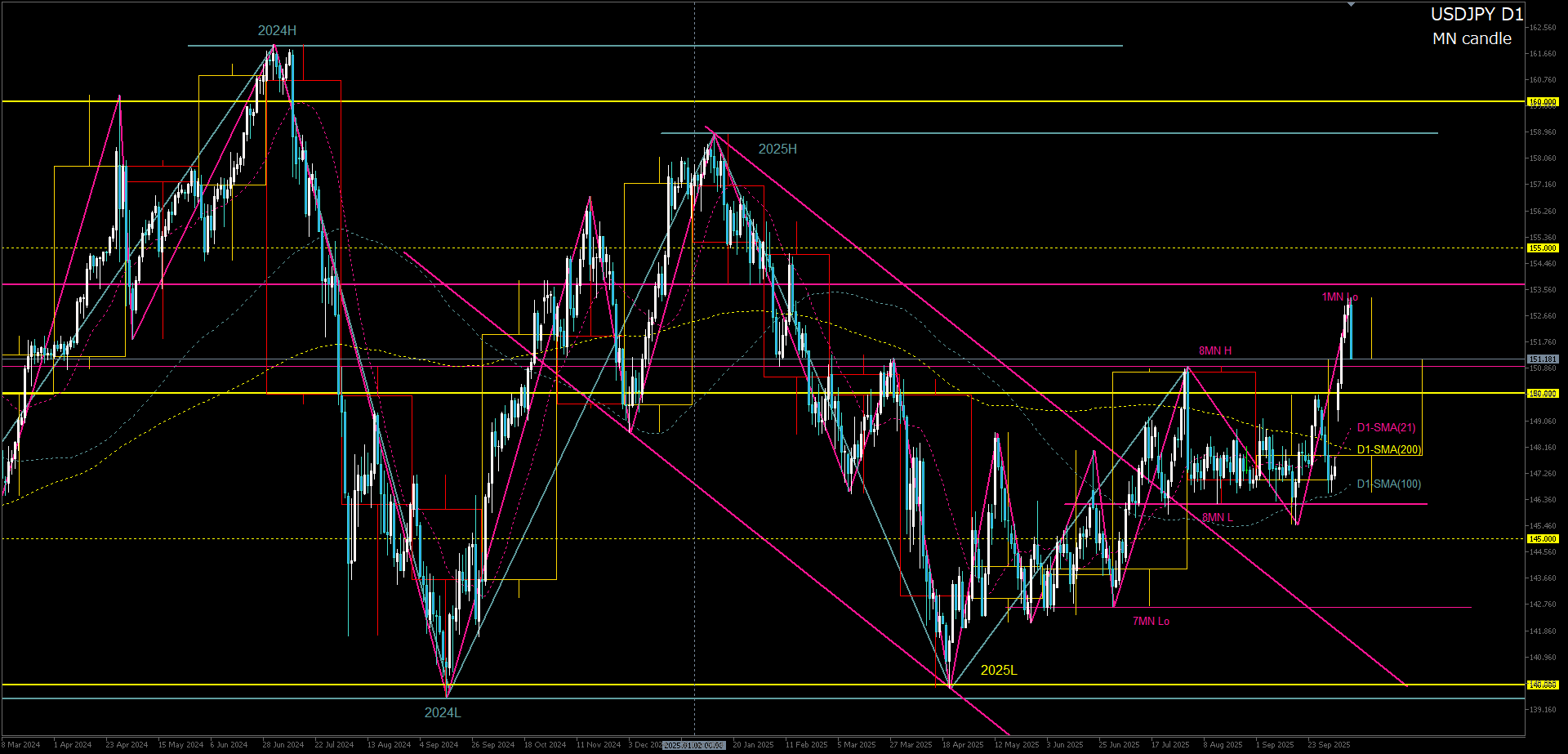 いつもご教授頂き有難うございます。とにかく今週のドル円は凄い相場になりましたね。自分も今週は今年一番の大勝となりました。今週のように特大の材料が出ている時はあまり余計なことは考えずに値が止まるまでトレンドについて行けばいいと思います。木曜日に公明党連立離脱のニュースが流れてきた頃からのドル円は153.000付近で値が重くなったのでショート目線に切れ替えましたが、金曜日にかけてショートで回してこちらもガッツリ取れました。自分が調べた範囲での政局情勢では立憲は首班指名の1回目から玉木氏に投票するようですし、維新も立憲がそう動くなら同調すると金曜夕方の読売テレビの番組で吉村代表が発言しており公明党は高市氏の名前を書かないと公言してますので、余程のことがない限り高市氏勝利の可能性は低いと思われます。そうなると来週は高市トレードの巻き戻しでドル円が大きく下落すると思われます。その場合には今週とは逆に下落が止まるまでは余計なことは考えずにひたすらドル円ショート一でいいと思います。但し何かのどんでん返しで高市氏優勢となった場合は高市トレード再開となってしまいますので政局のヘッドライトには十分注意したいと思います。とにかく今回実感したのはしっかりチャンスを待つことの重要性ですね。8月初めから長い間ドル円はレンジを続けていたのですが、こういったところで無駄なトレードを繰り返して資金も精魂も使い果たしてると今回のようなボーナス相場が来た時に勝負できません。1年の大半は値動きが乏しく難しい相場ですがそれでも年に数回は今週のようなボーナス相場がありますので、相場が動いていない時にしっかり力を貯めておいてチャンスがきた時にガッツリ稼げるように今後もしていきたいと思います。