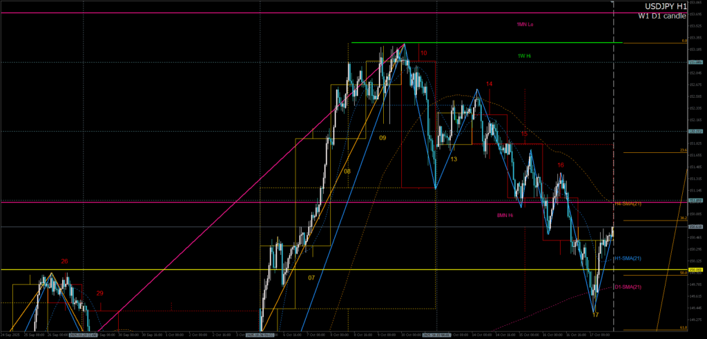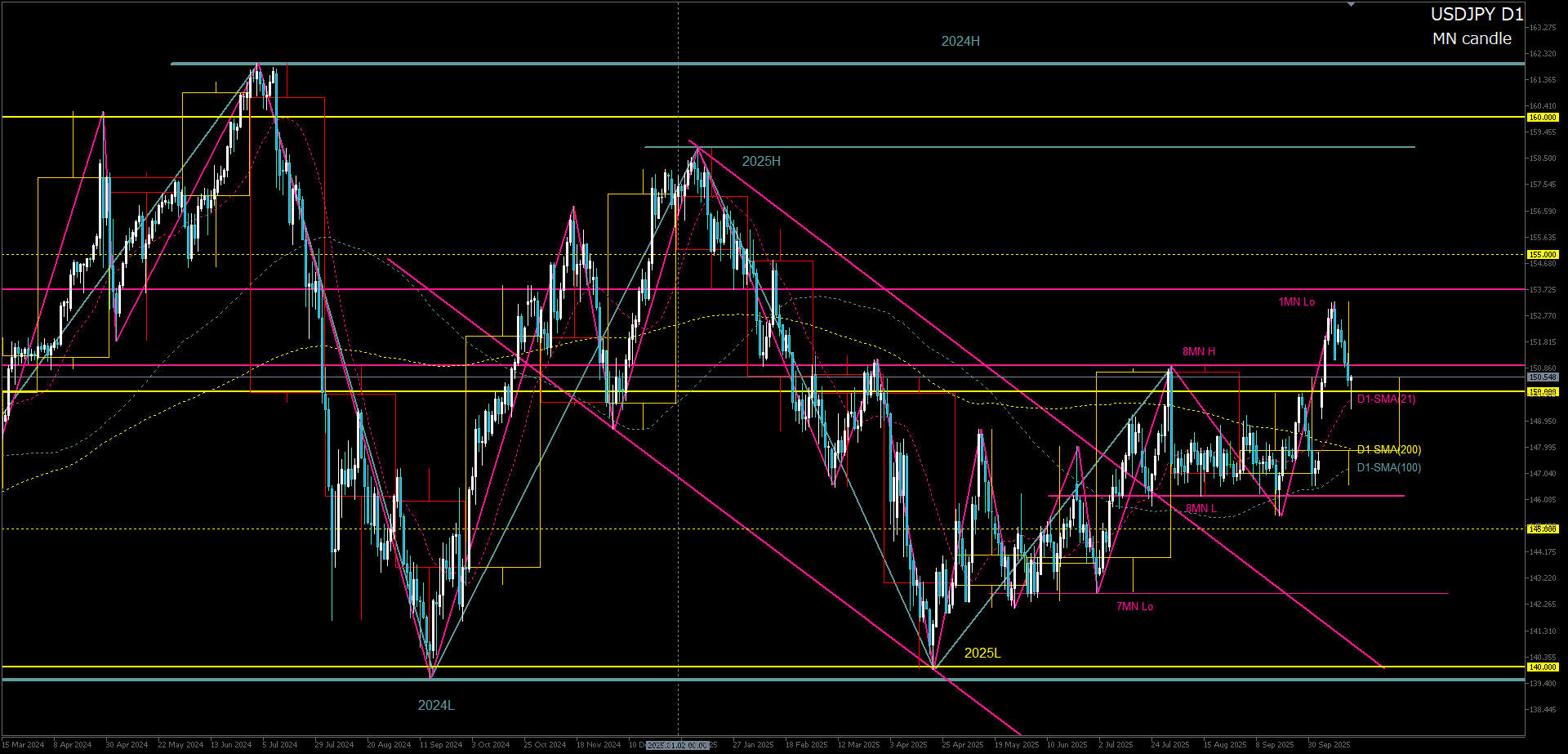 テクニカル的には10月安値上昇波の半値押し(150円)+D1-SMA21を試す展開。