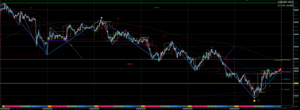 東京時間、先週高値下降波の152.0戻り目が、ロンドン初動に崩れて、H4-SMA21への戻り待ち
