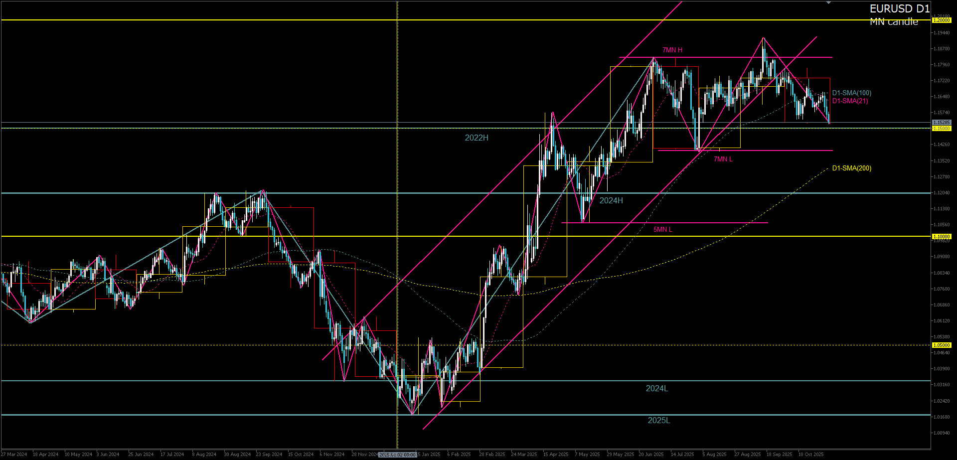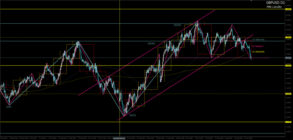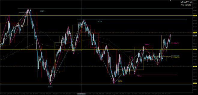 2025年高安のダブルボトムが意識され、150円+前回高値(8月高値)を10月陽線がほぼ更新