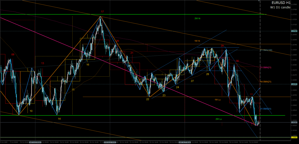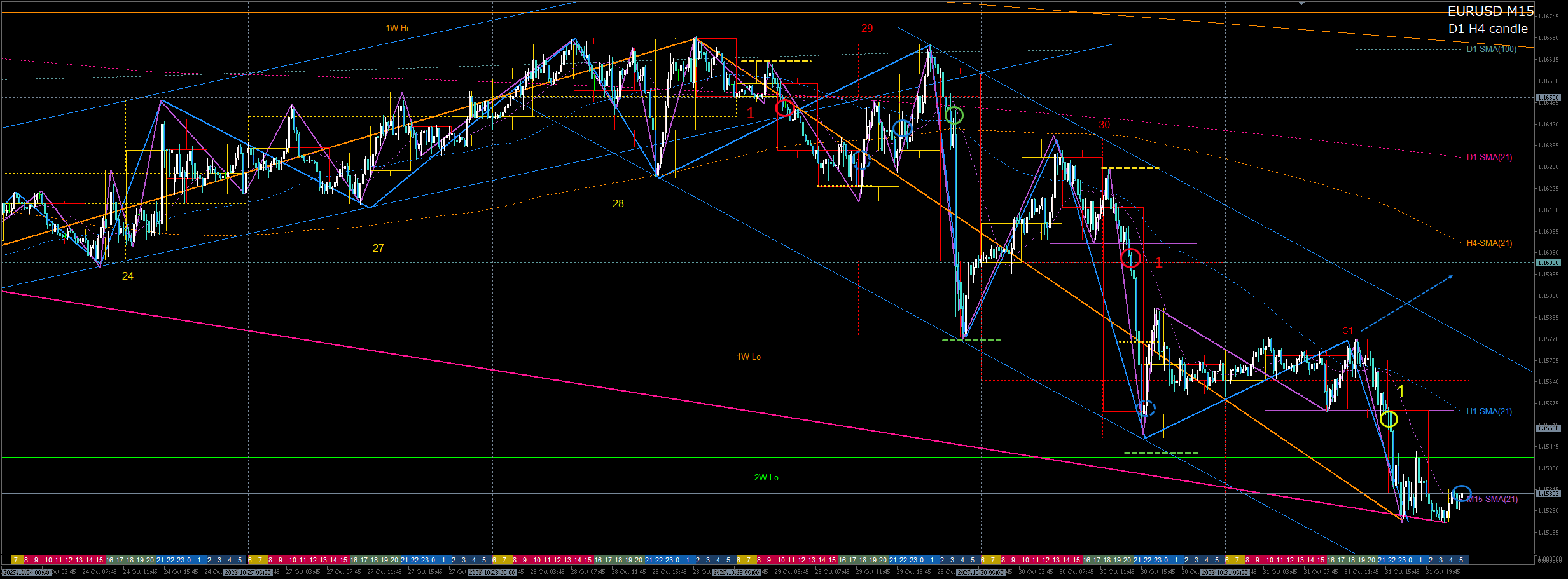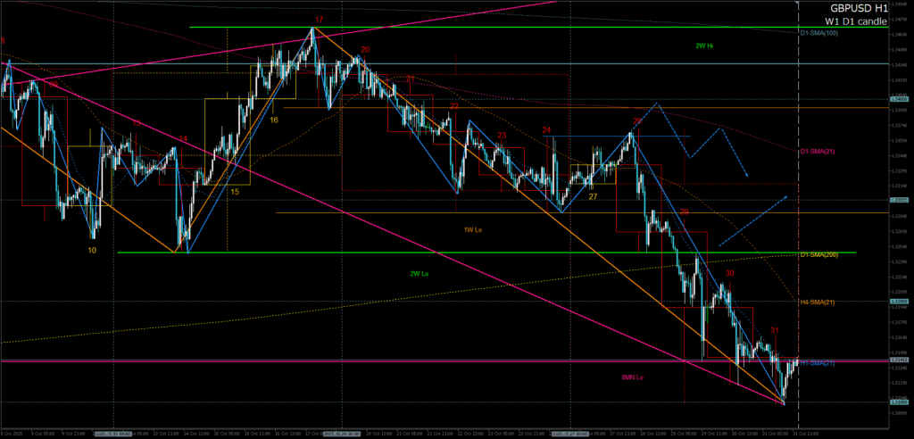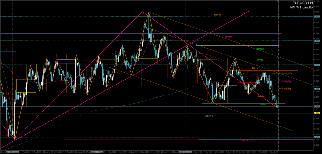 先週安値上昇トレンドが先週高値+日足SMA21付近で1時間足レベルのダブルトップを形成後、FOMC急落で下降トレンドに転換していました。