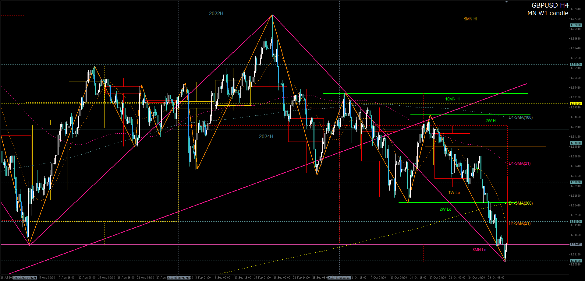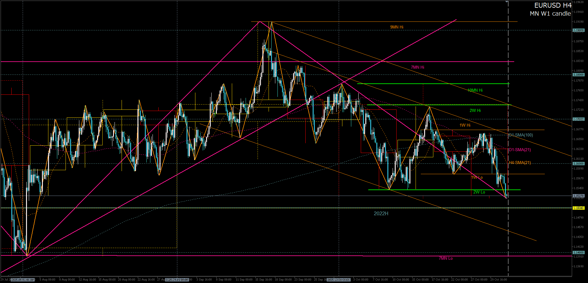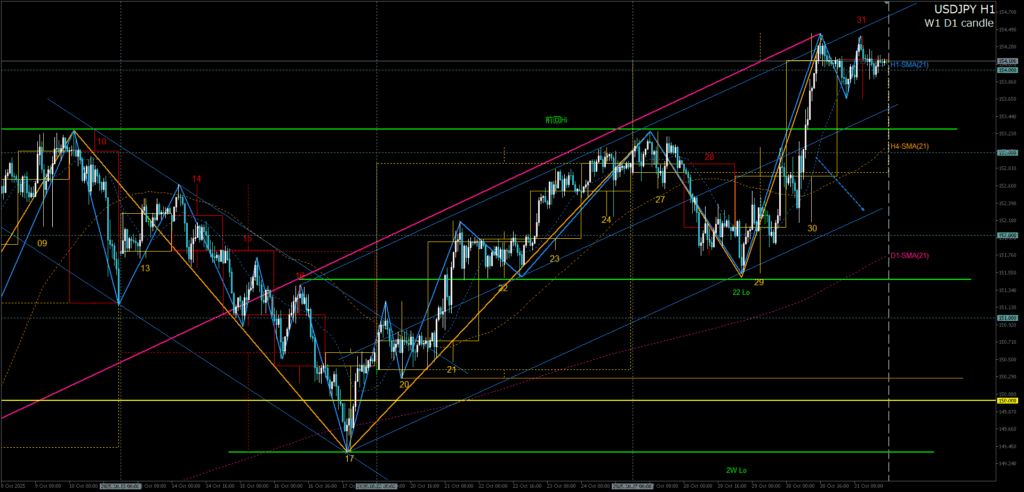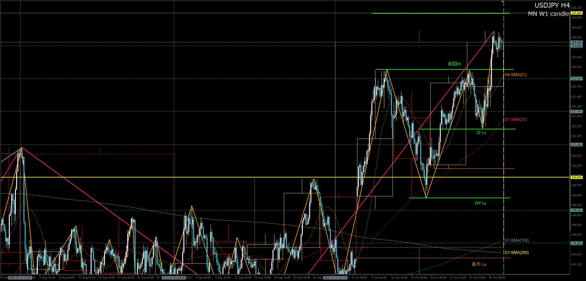 いつもご教授頂き有難うございます。今週のドル円は週前半は日米中銀会合や米中、日米首脳会談等のイベント待ちで様子見ムードでしたが、木曜には153.000のレジスタンスを上抜けすると154.400付近まで一気に上昇し、今週のドル円のトレードチャンスとしてはここしかなかったと思います。これも153.000という明確な根拠がありましたし、日米の金融政策が市場の期待から交代したというファンダ的にも分かり易い根拠がありましたので取り易い流れになったと思います。動画内でも解説がありましたようにエントリーする上で誰が見ても分かり易い根拠があるというのは非常に大事なことだと思いますし、損切りにしても明確な根拠のあるバックが近くにあるかどうかを確認してからエントリーしたいです。来週のドル円の関してはとても売っていけるチャートではないと思いますので、引き続き買い場を探る週になると思いますが、分かり易い根拠になりそうなのは154.400レベルでここを上抜けしてくるようですと155.000を目指して上昇するでしょうし、下は153.800レベルまで押されて下げ渋るようであれば明確なバックになると思いますので時間とのランデブーで買ってみたいです。但し154.000を挟んだレンジになる可能性も十分ありますし、アメリカの政府機関閉鎖に伴い米雇用統計はないものの民間の雇用関連指標はありますのでしっかり様子見したいです。いずれにせよ様子見と根拠ある損切りはトレードの2大手法だと自分は思ってるので、しっかりこの2つを意識してトレードしたいと思います。