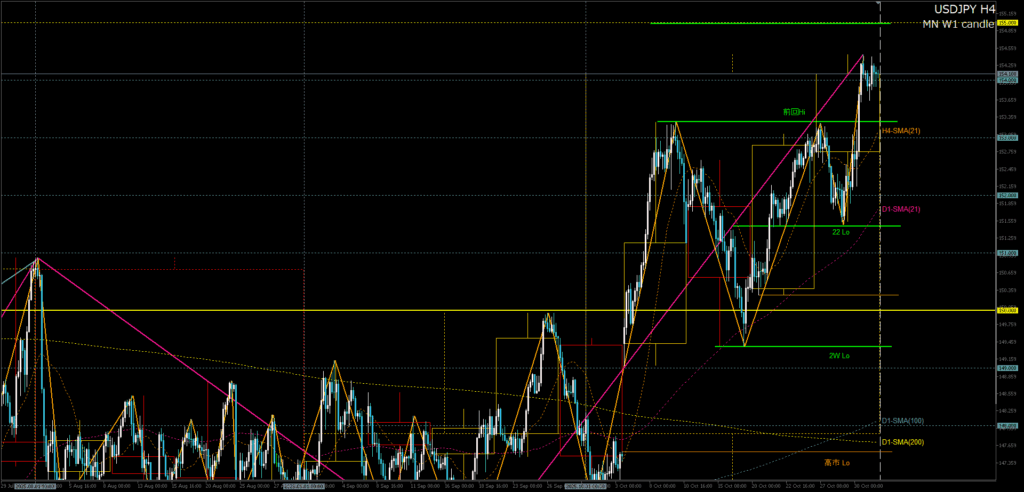 結果的に、今週足終値ベースで前回高値を更新し、「2番天井を抜けた上昇トレンドの再開」という形で10月を締めくくりました。