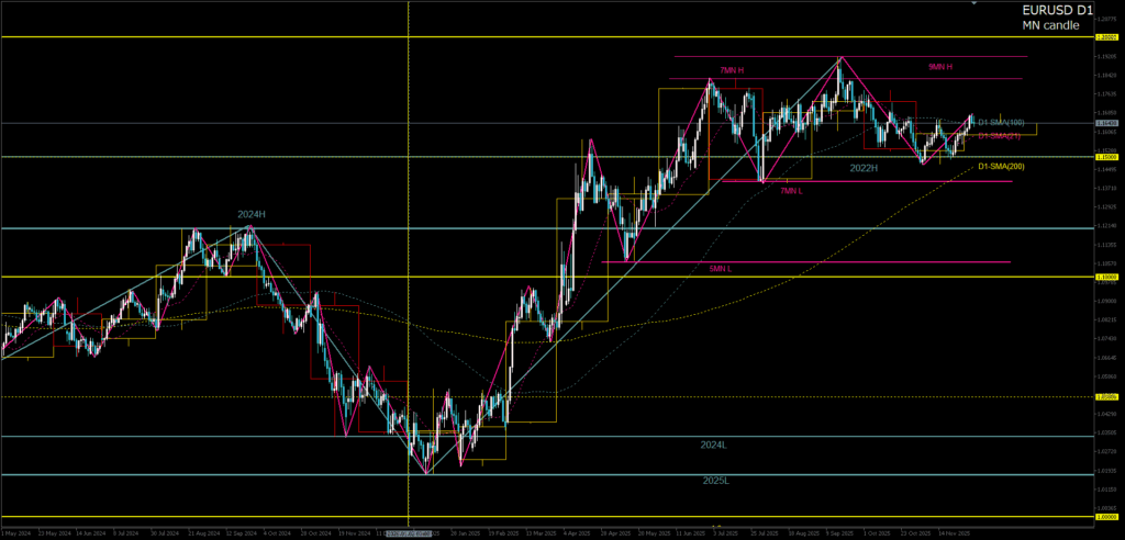 • 11月陽線終値が155円を明確にブレイク → 4時間足上昇トレンドの再開で、2025年高値が射程に入る。