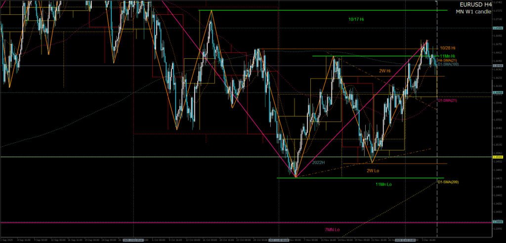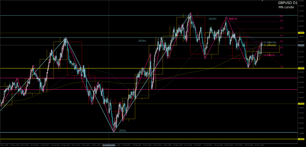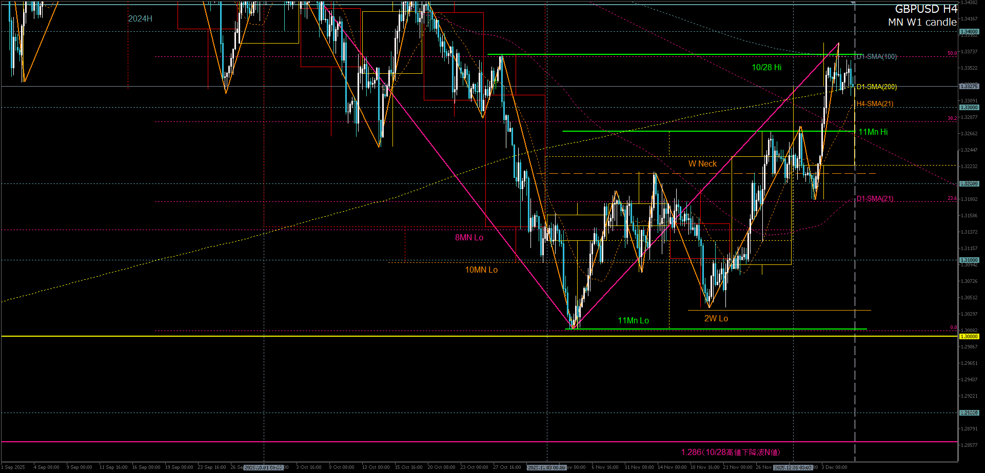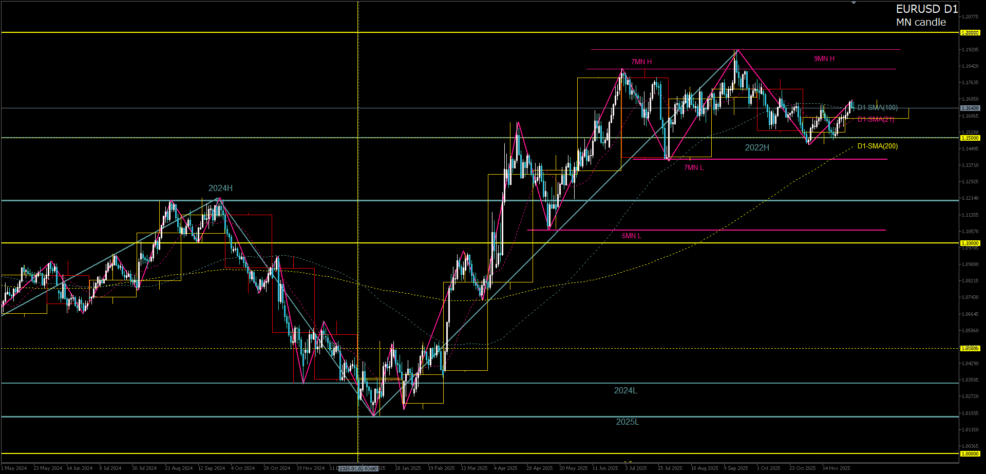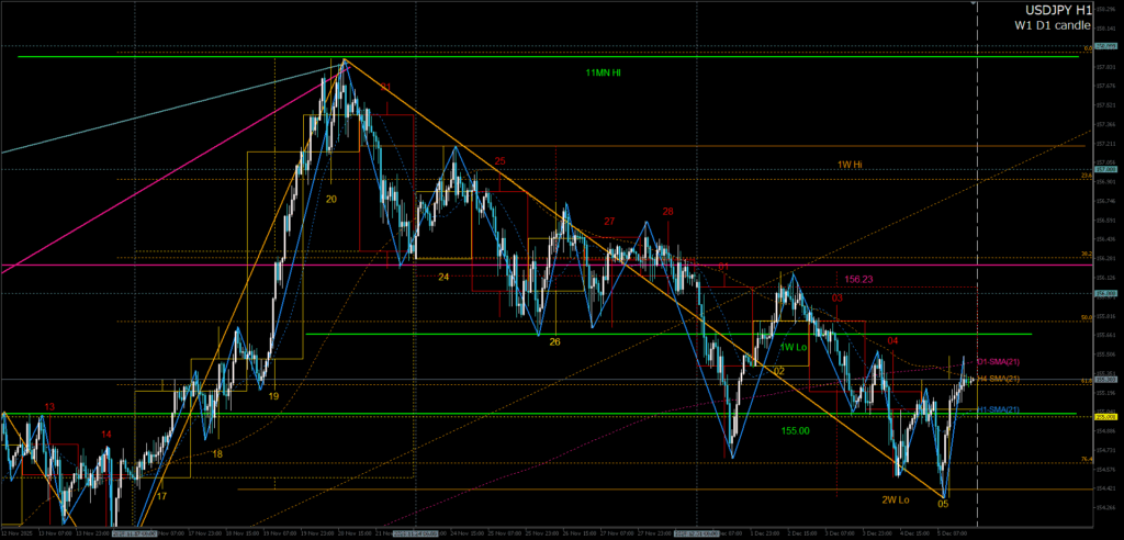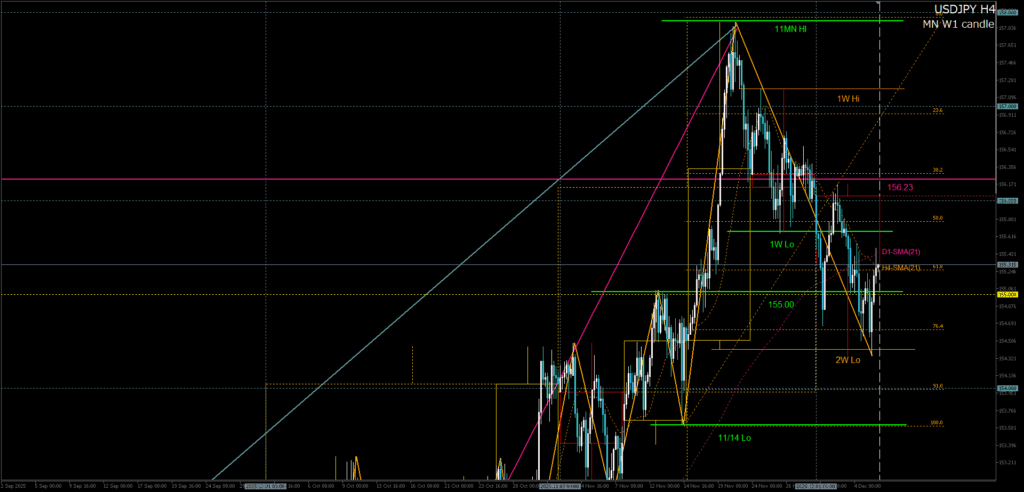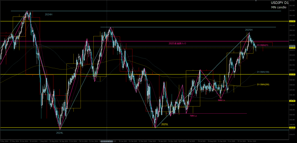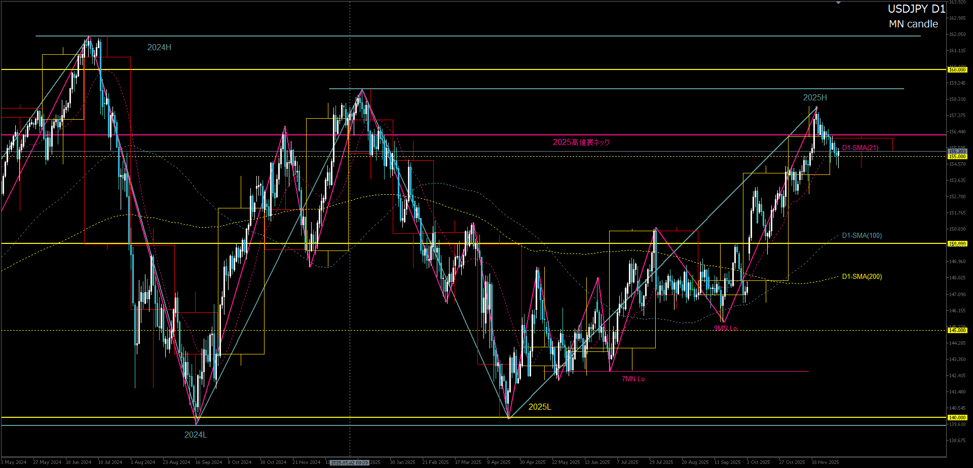 • 2025年高値裏の156.23ネックで反発、11月足はコマ足で着地しており、12月は日足レベルの調整下落が起きても不自然ではない。