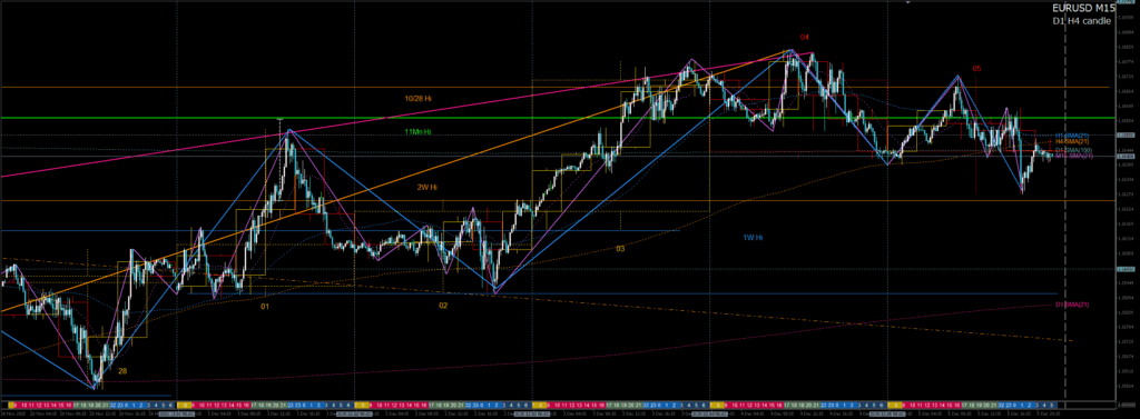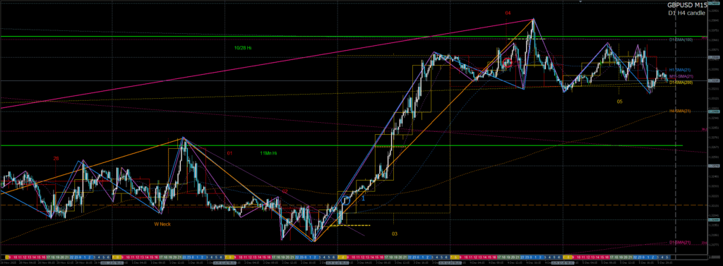 自分は先週安値の押し目候補にて1H青波の高安が共に更新できず横ばい縮小したレンジと捉え、売るならレンジ中段での持ち合いクラスタ形成から決着が必要と判断、