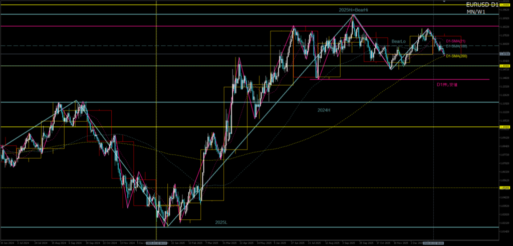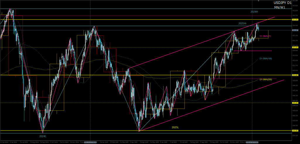 - 12月足は、2025年高値に届かずコマ足で確定。大局の上昇トレンドは維持しているものの、高値圏でのエネルギー減衰と反転示唆が同時に現れた月足といえる。