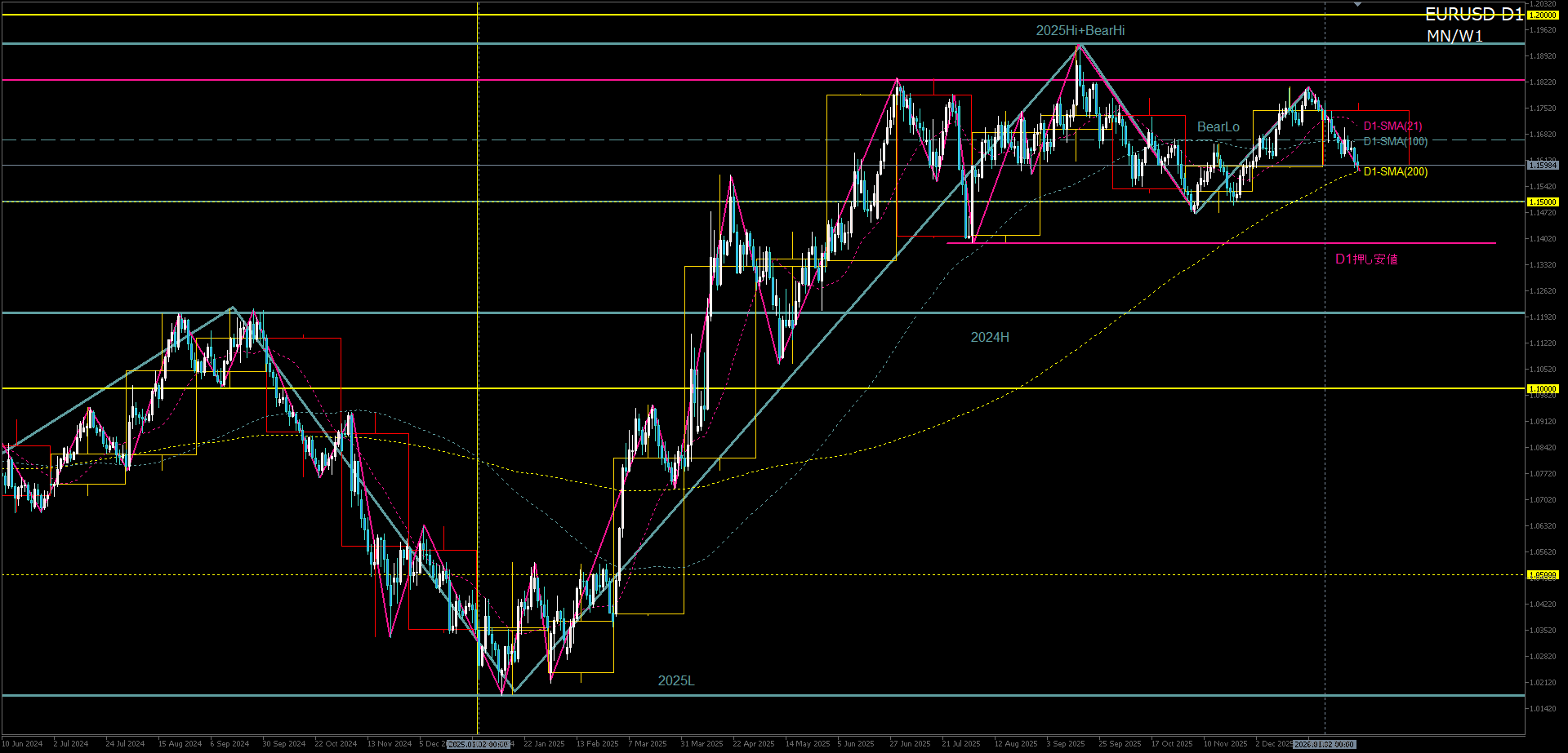- ユーロドルは、1.200という心理的節目を目前に2025年高値を確定し、現在は高値圏での調整フェーズに入っている