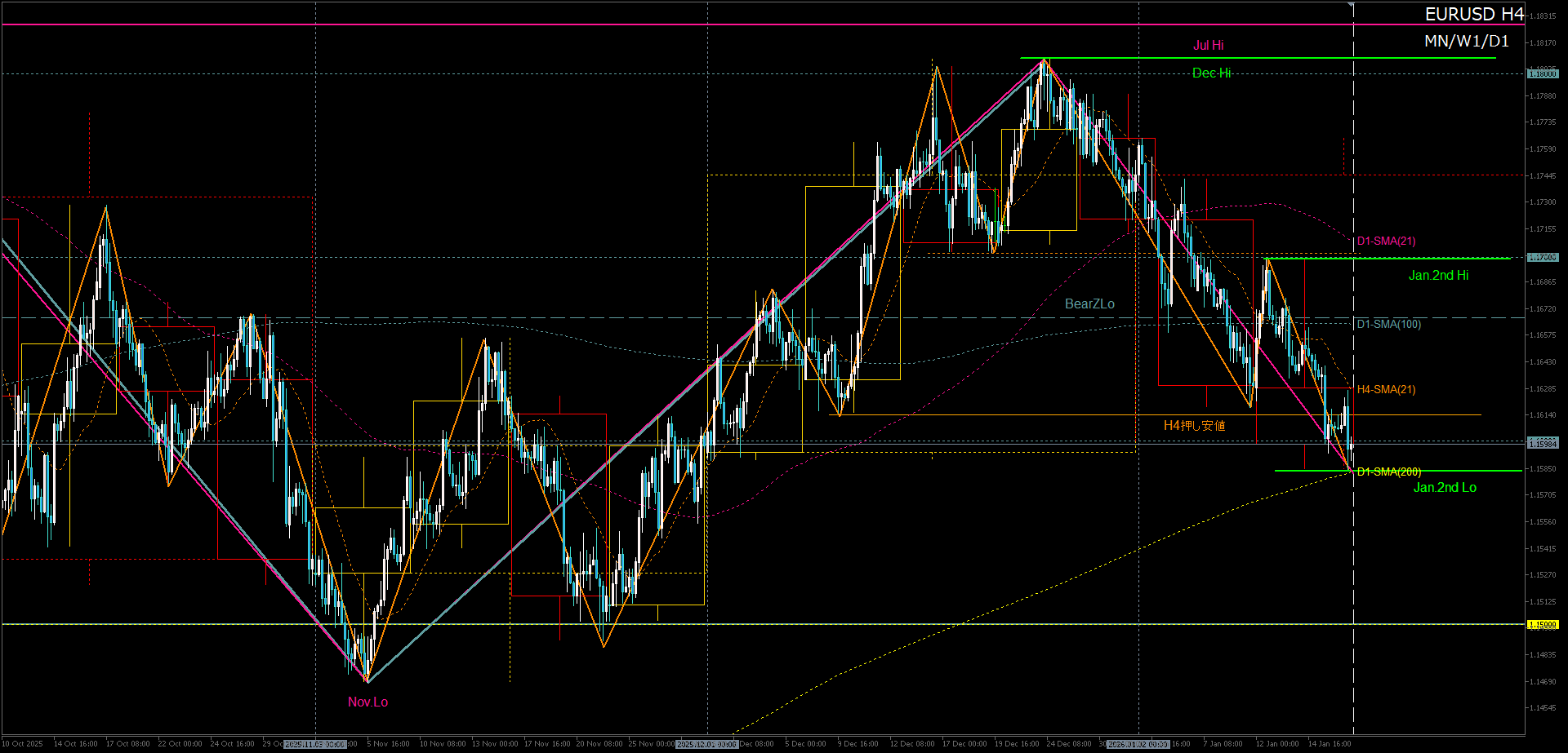 H4上昇波の12月高値周辺押し目買い→2025年高値への再トライ