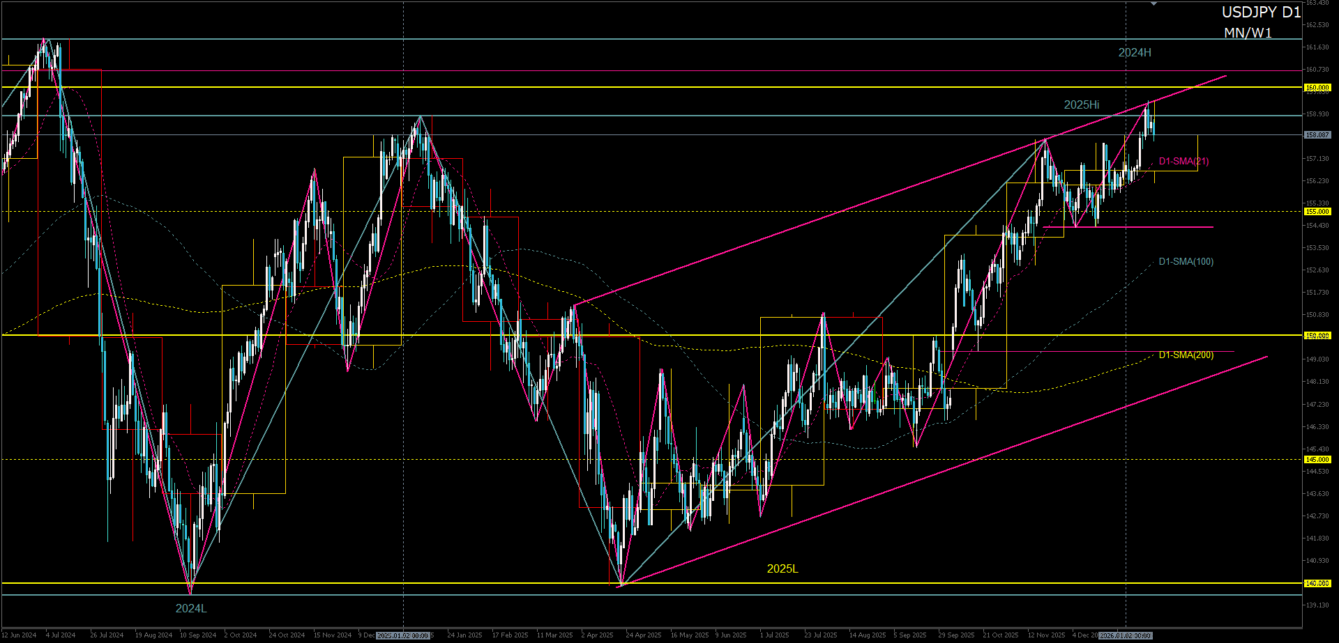 一方、2025年高値+D1上昇チャネル上限に到達して以降は、上昇トレンドは維持したまま高値圏の調整フェーズに移行。