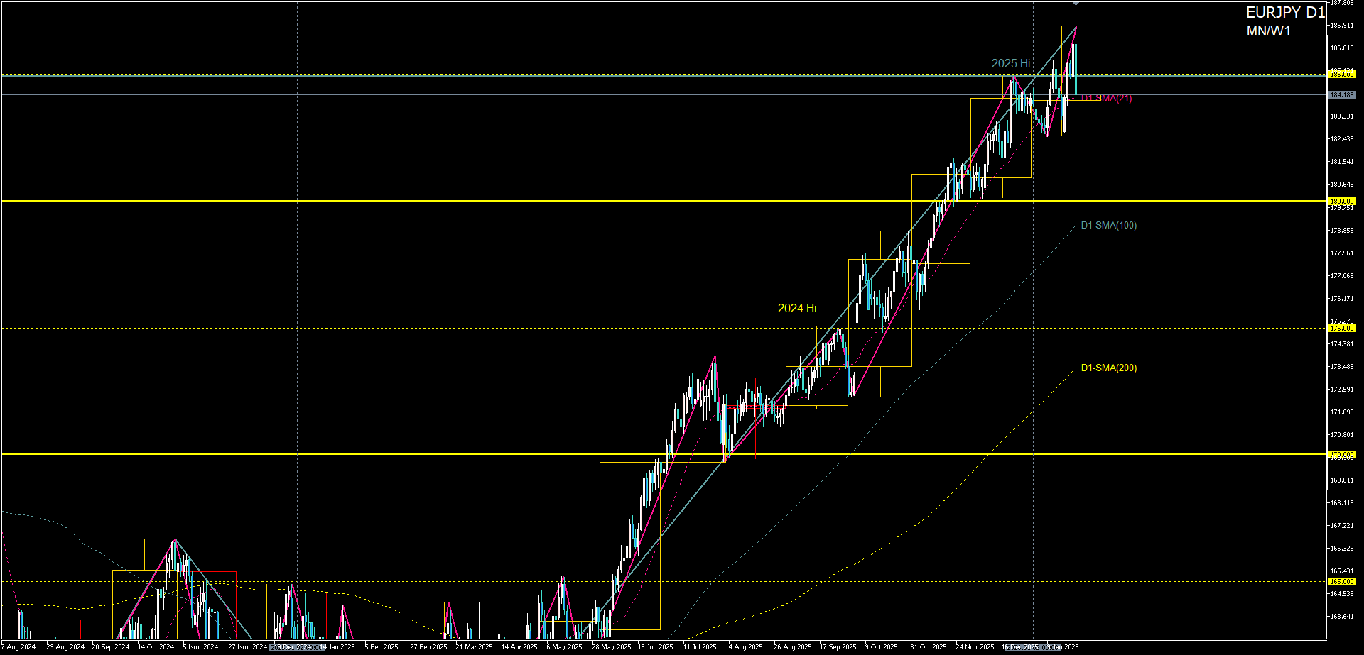 - 高値圏に位置する一方、D1-SMA21が下値を支え、上下どちらも決め打ちしにくい拮抗状況。