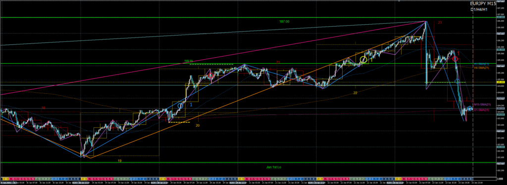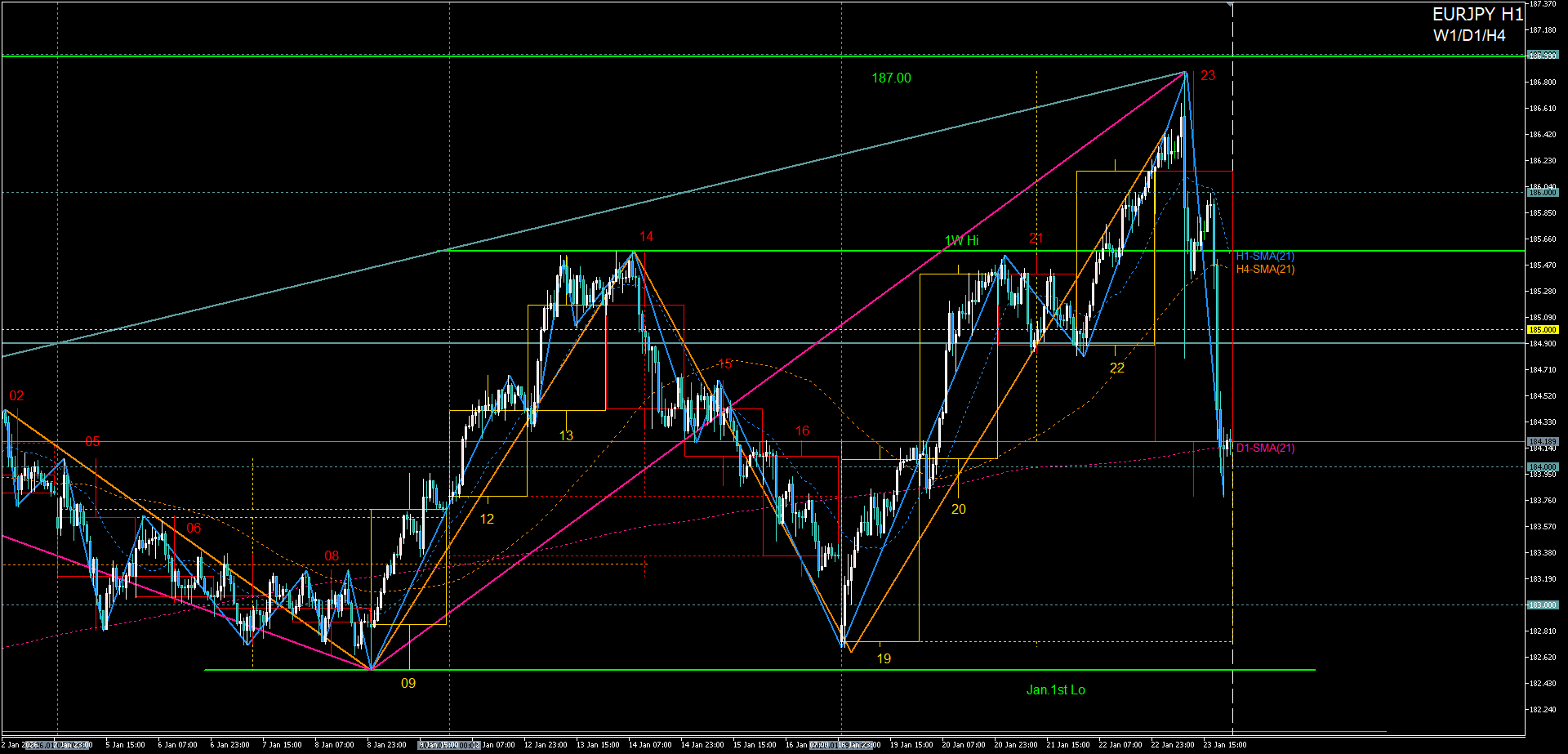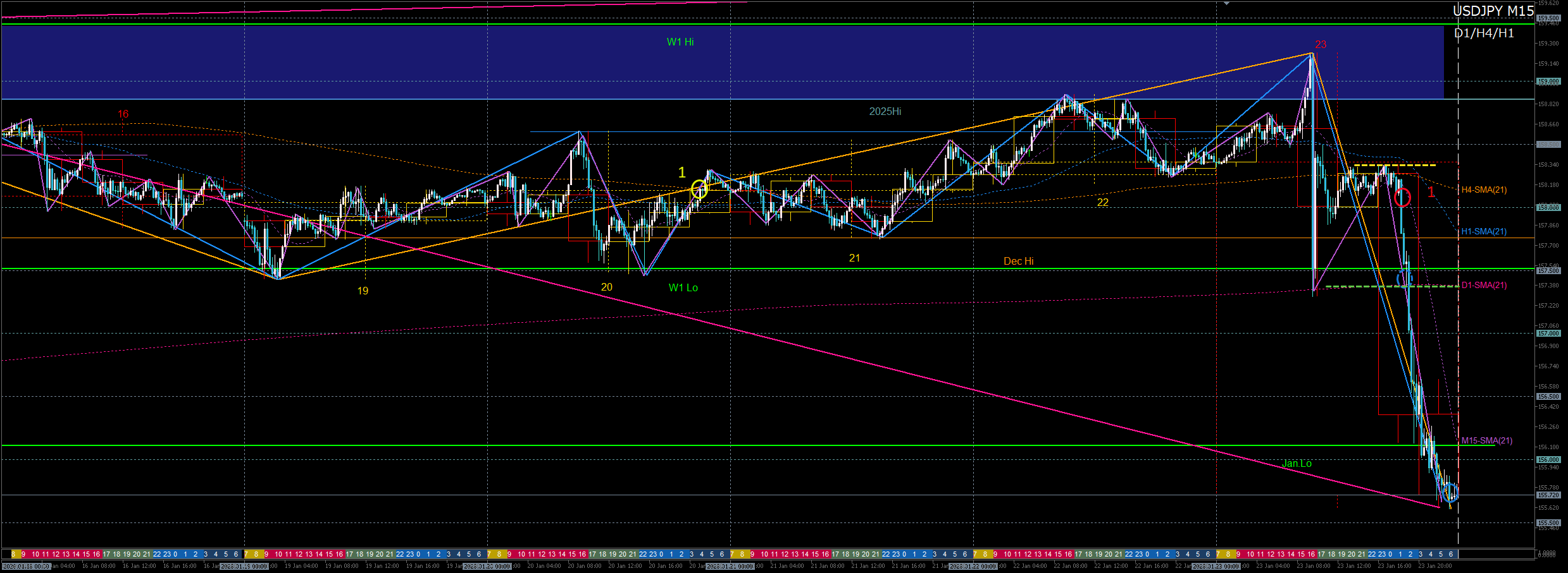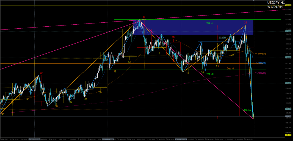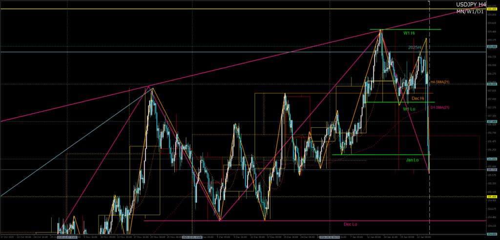 - H4上昇波が12月高値周辺で押し目崩れ→1月安値へのD1調整波を売る