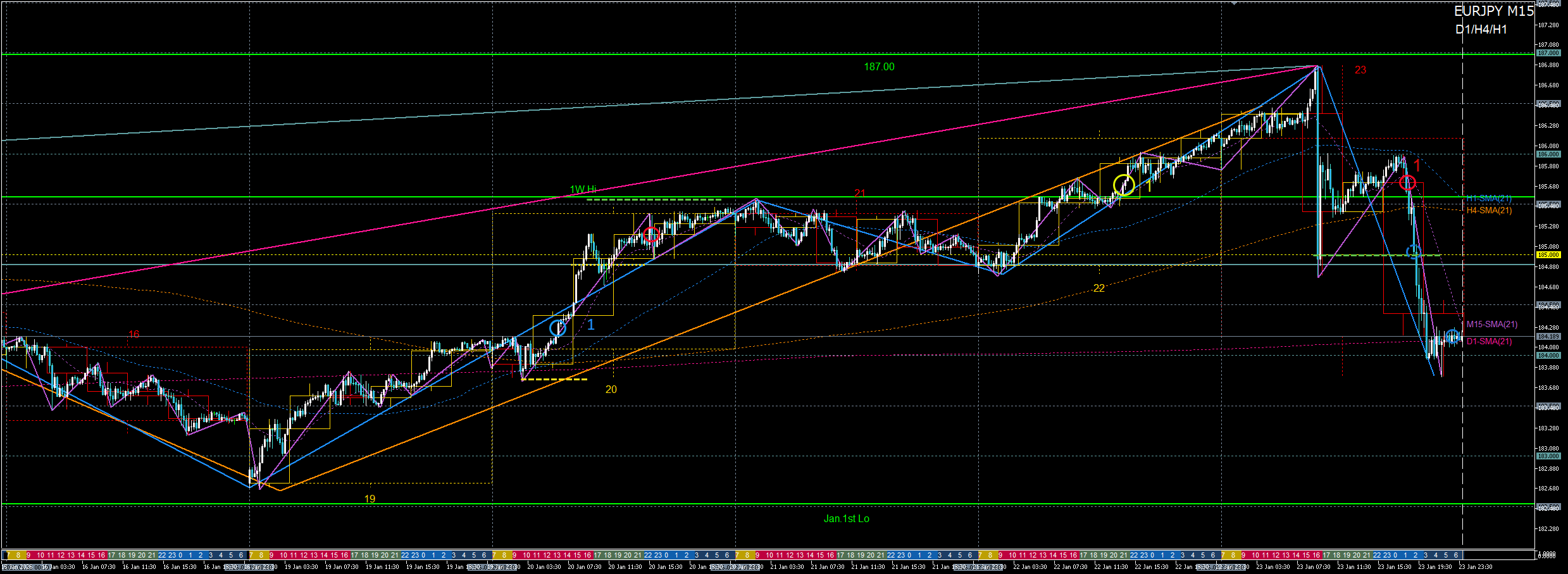 ただし、ユーロドルがすでに上値余地の乏しい位置という「位置の悪さ」から、黄①ロングは見送り。
