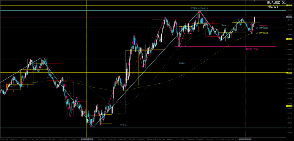 - 2025年高値とD1チャネル上限が重なる上値抵抗帯で反発。