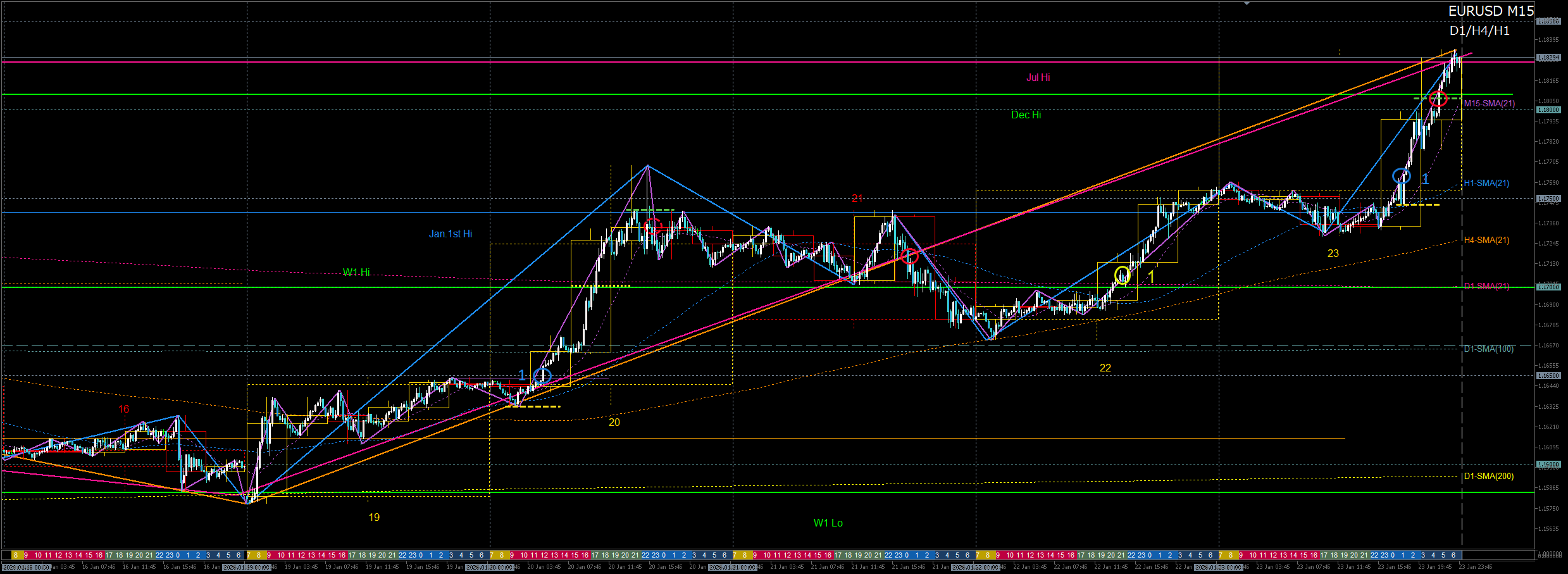 - 前日の強気陽線を根拠に、15日高値起点のH1下降波の戻り売りが否定される動きを確認後に、2025年高値へ向けてロング。