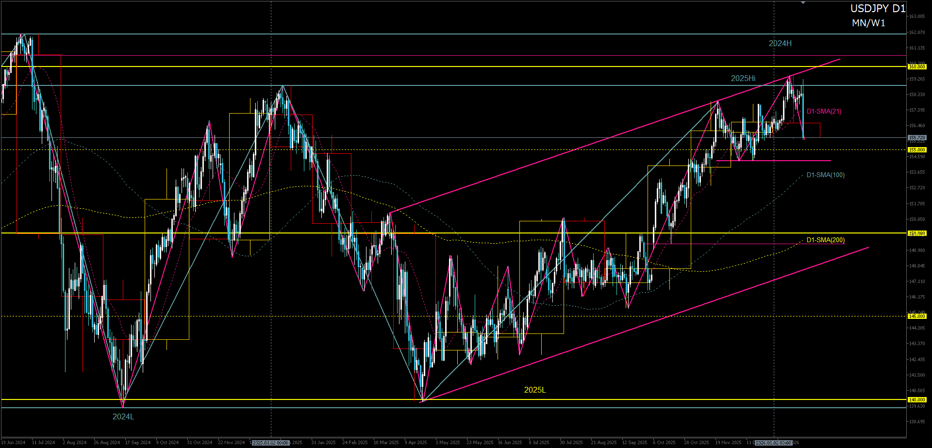 - ドル円は現在、160円という心理的・政策的にも意識されやすい大節目が視野に入る水準に位置している。