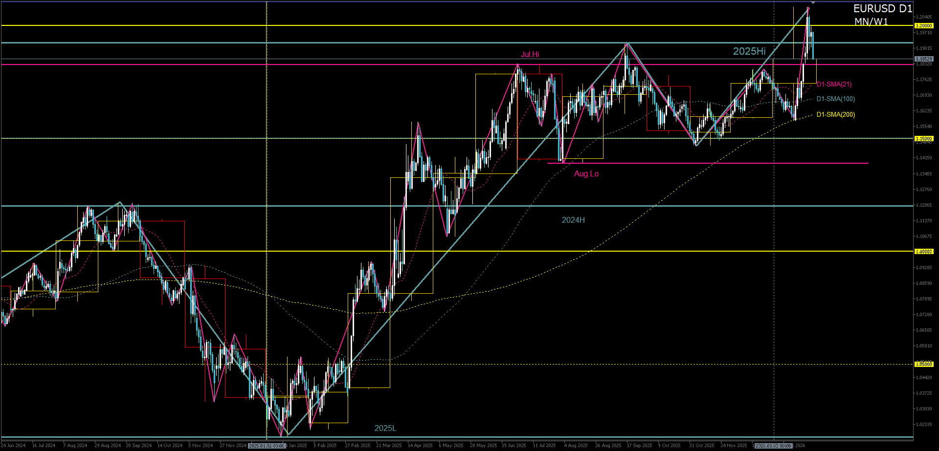 2025年高値と1.20を実体でブレイクし、週足レジスタンス下限(1.21)手前まで急騰。