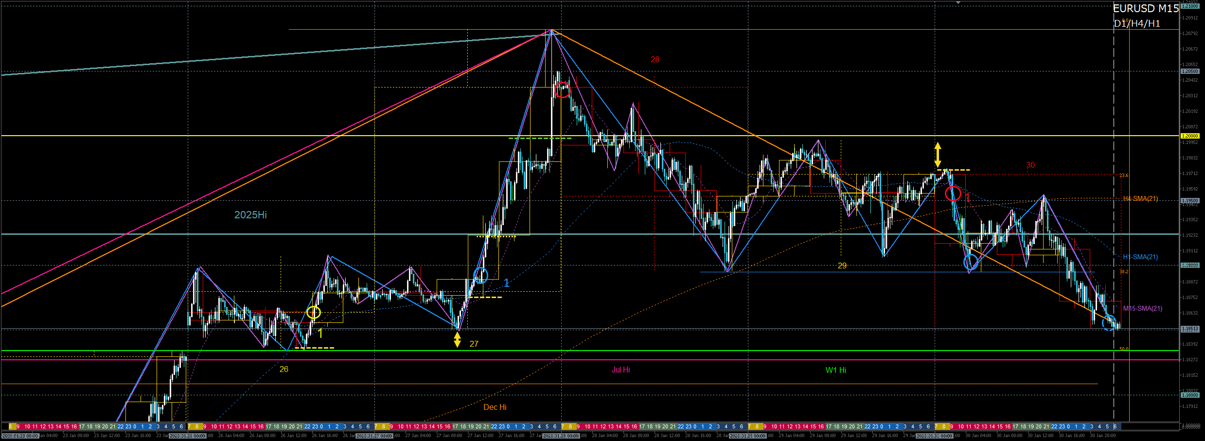 →4HSMAは崖のような角度で上から接近、SMAは角度つくほど機能する可能性高い、1H足で見ると1/29(木)に2回反発していたので絶賛機能中と判断。