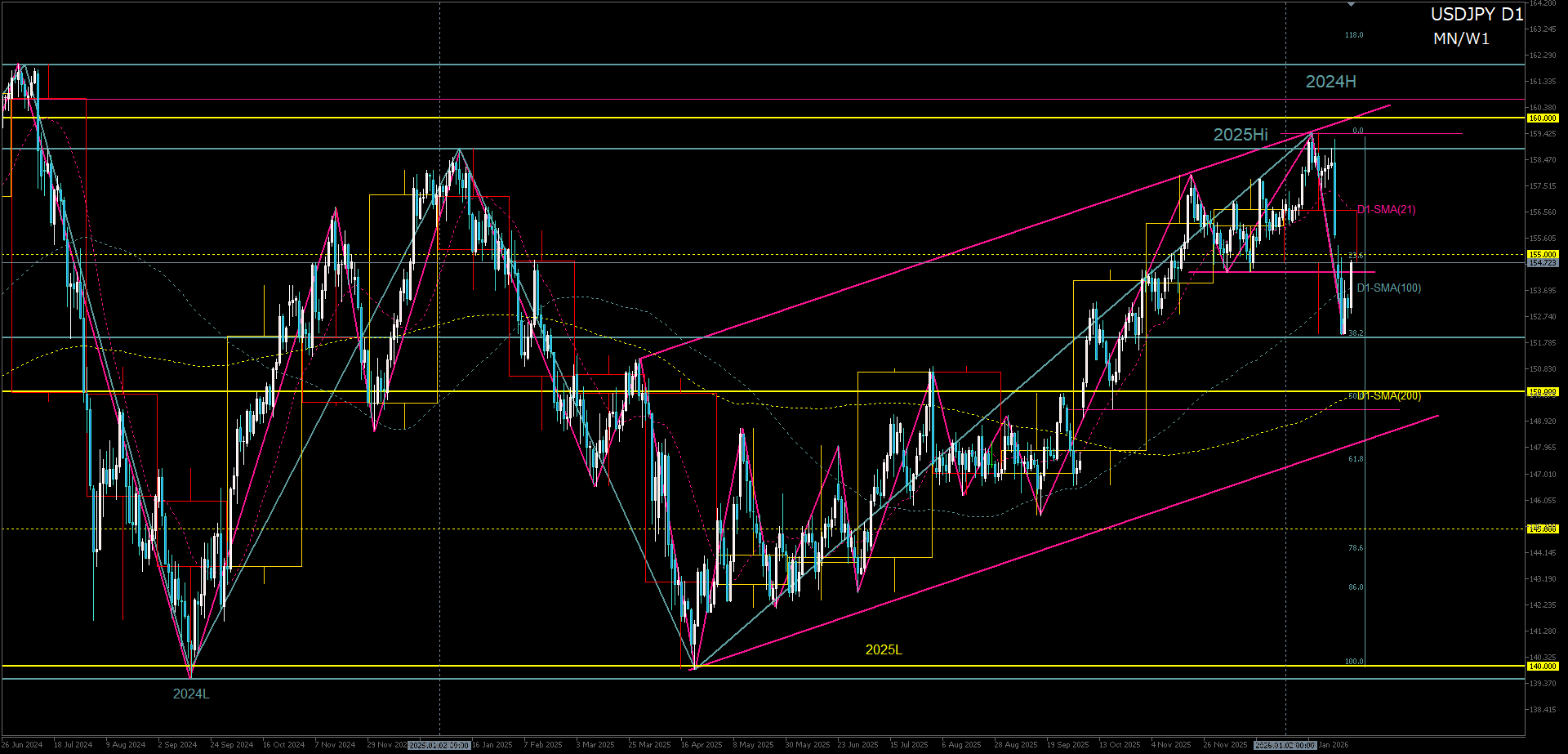 12月安値や100日線といった日足のサポートを下抜け、週足のサポート(152円/2025年安値起点W1上昇波F38.2%)まで一気に下落しました。