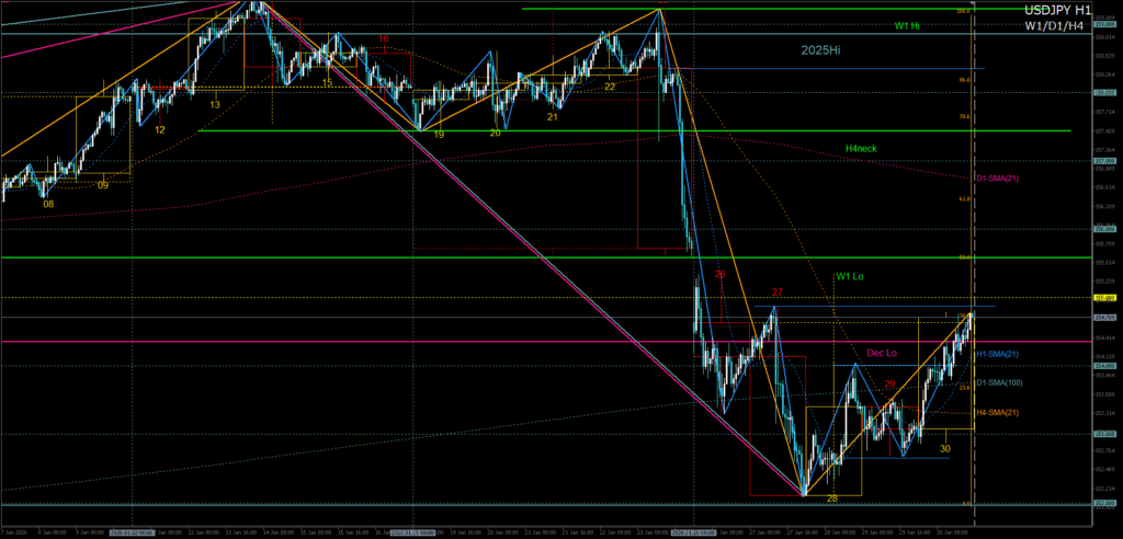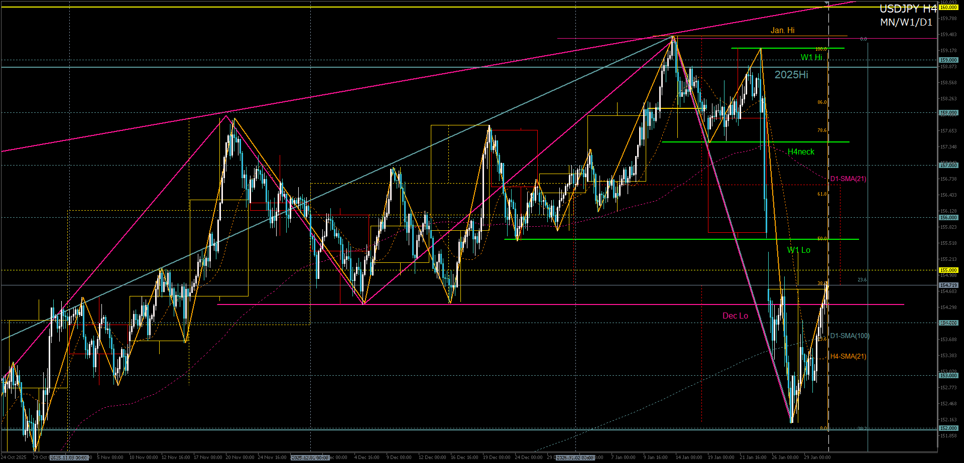 ここは重要ですが、力関係で見ると、H4-SMA21(レジ) < 152円(サポ)と見立てました。152円が本当に強ければ、SMAは時間をかけて、いずれ上抜かれます。SMAは“止める理由”というより“抵抗要素”くらいの扱いで考えてます。