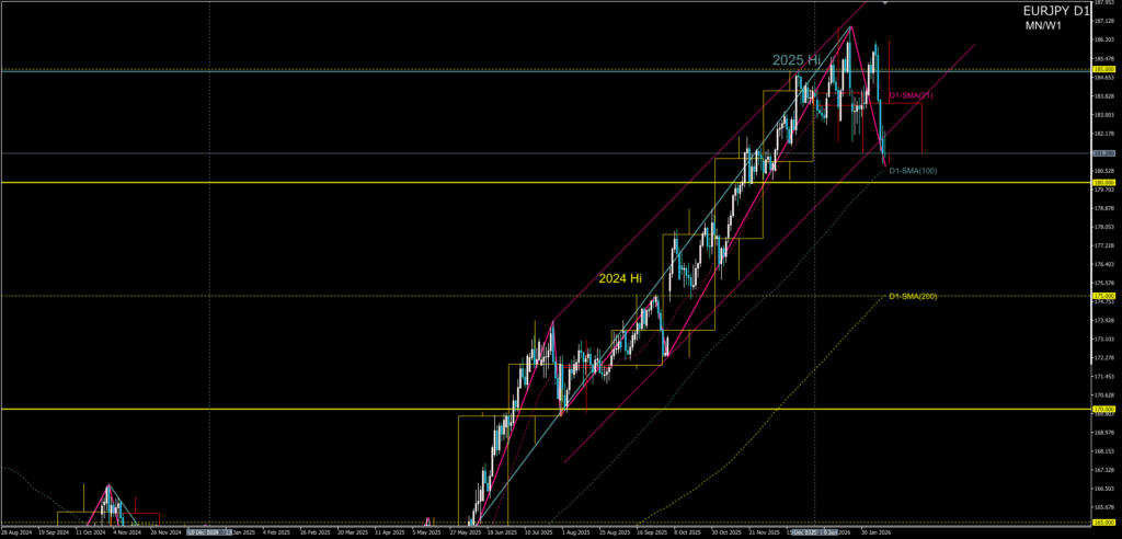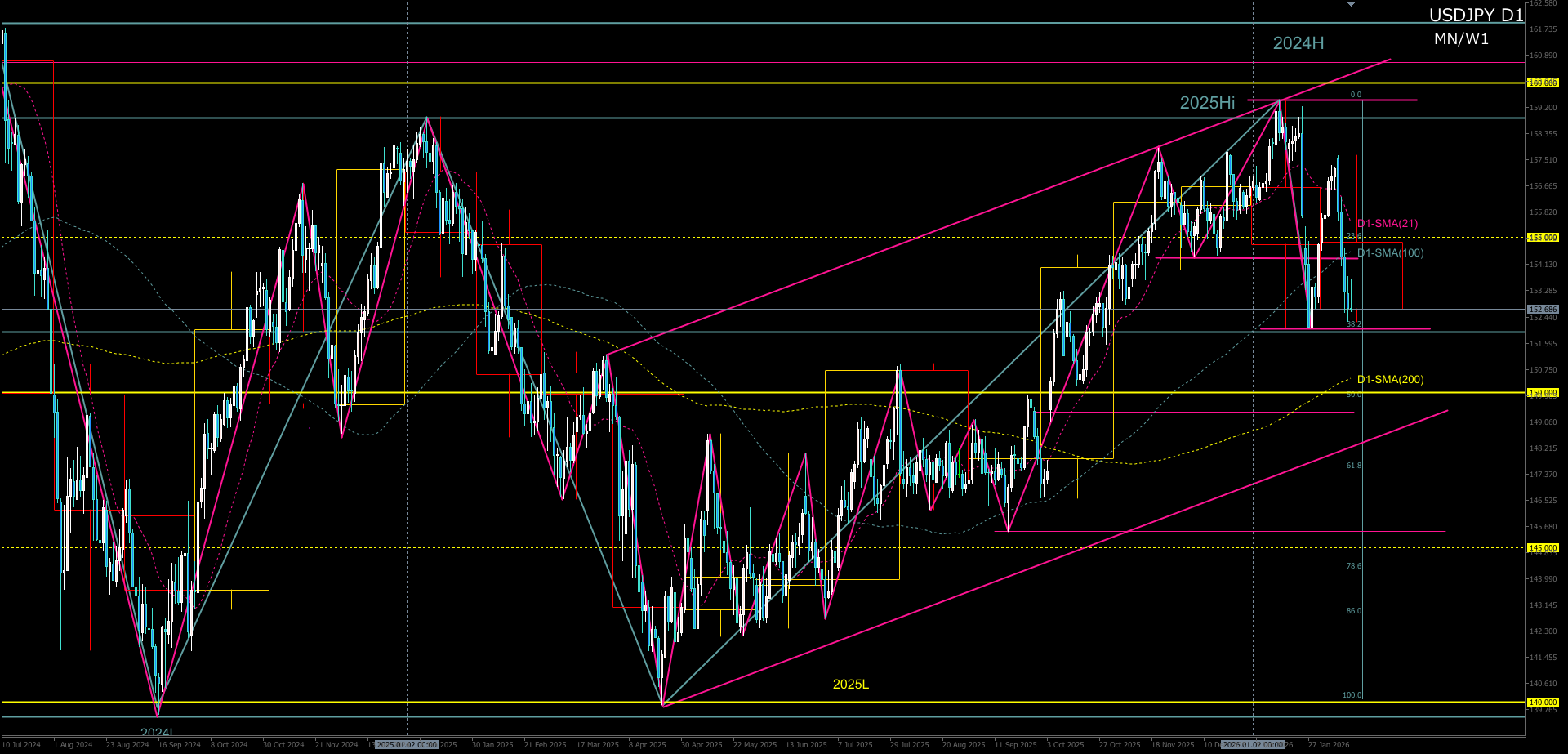 - しかしその下落は、152円週足サポートで日足レベルの押し目買いが入り、現在は、2025年高値圏へ再トライ中。