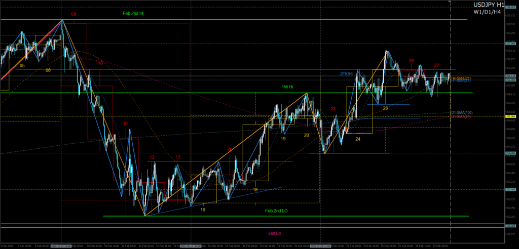 • 特大構造:日足レベル(特大構造)は、1月高安レンジの攻防継続。
