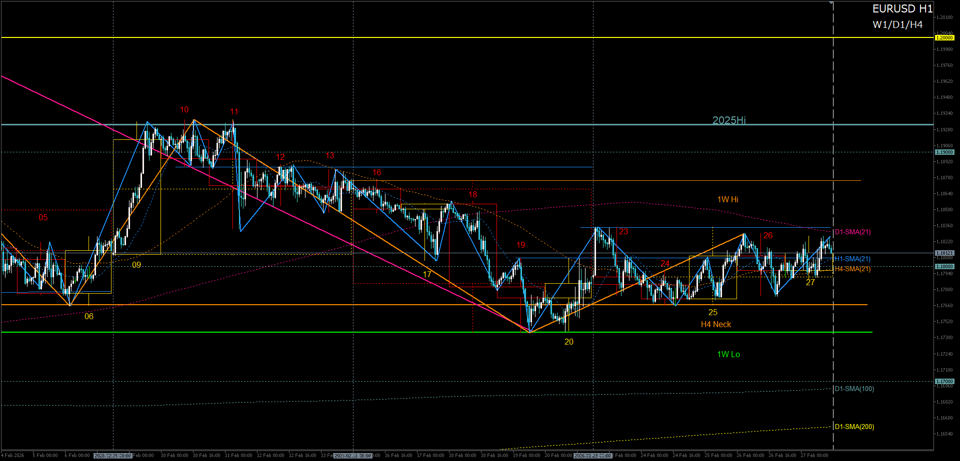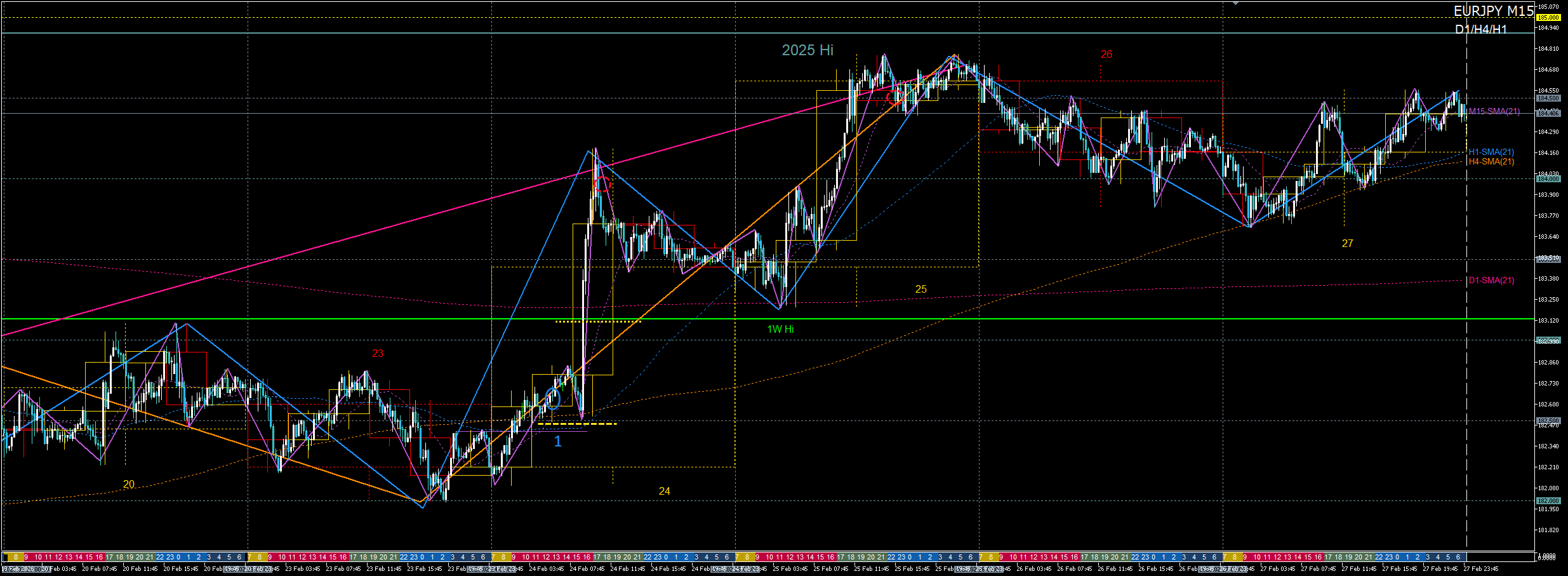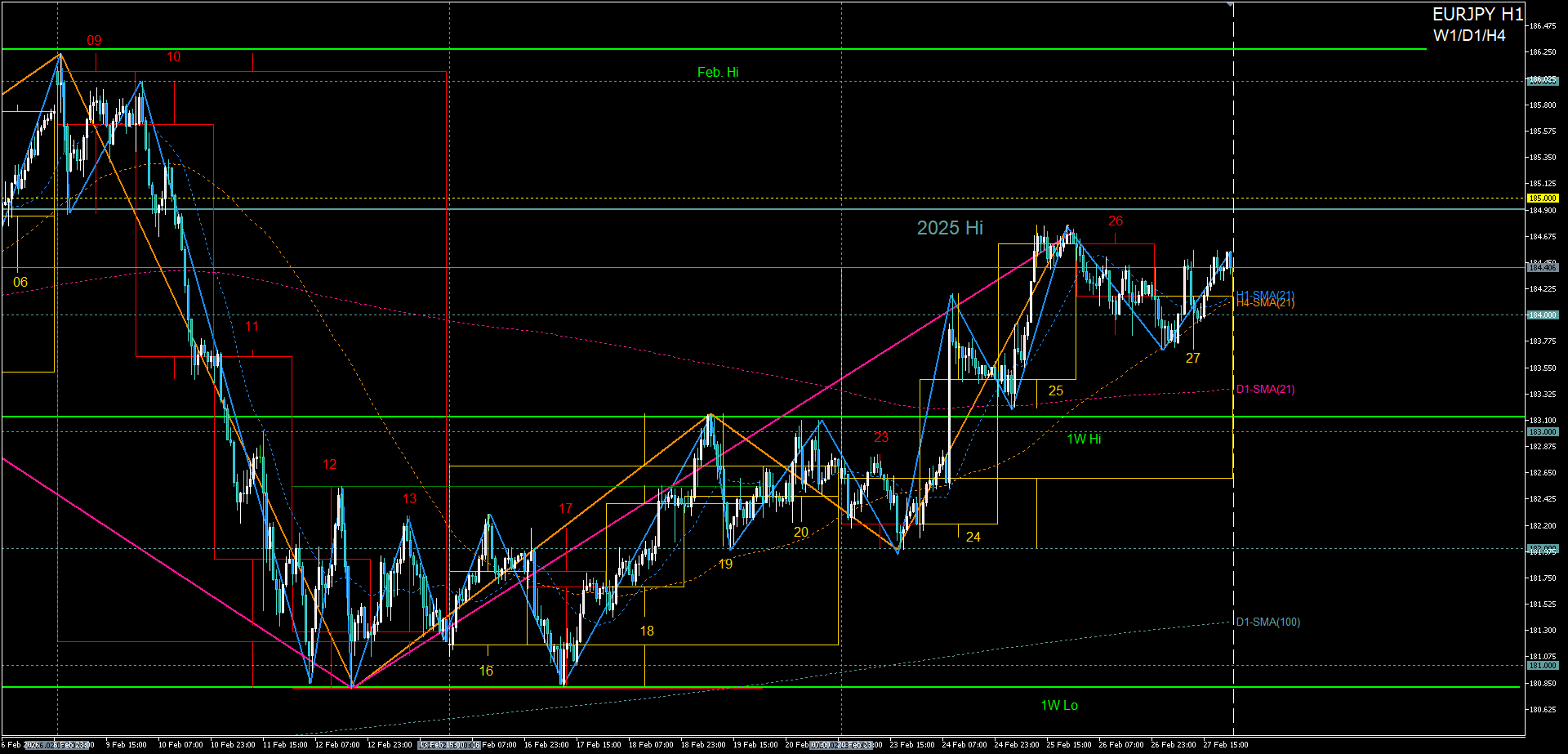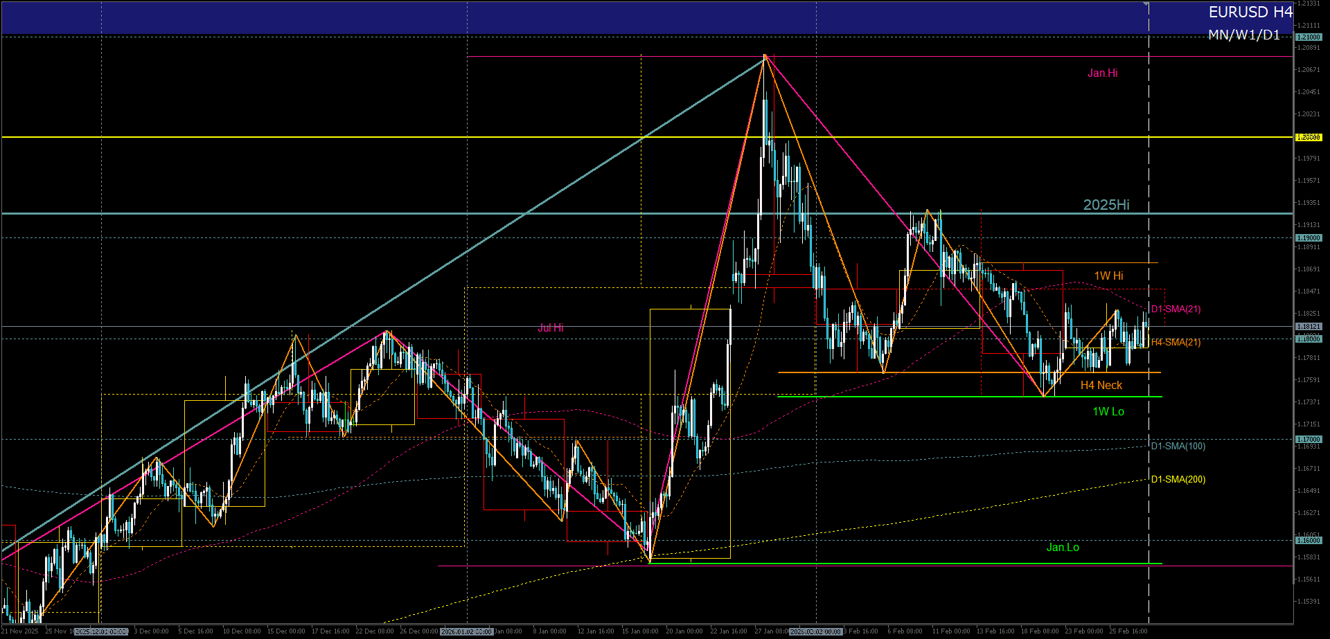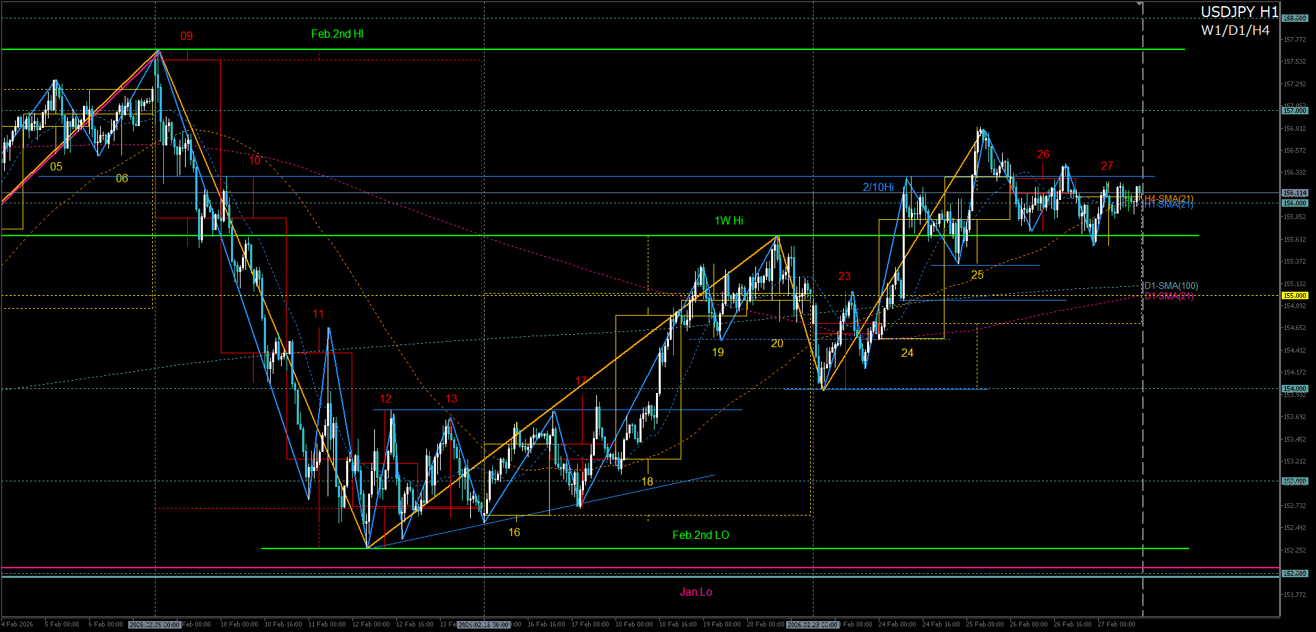 1. 先週高値のH4戻り売り失敗で2月第2週高値へロング