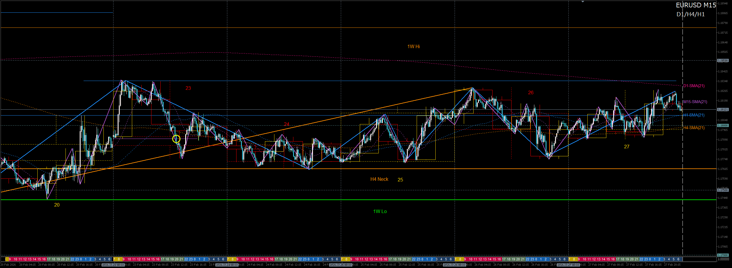 先週高値のH4戻り売りが否定され、H1上昇トレンドが再開。