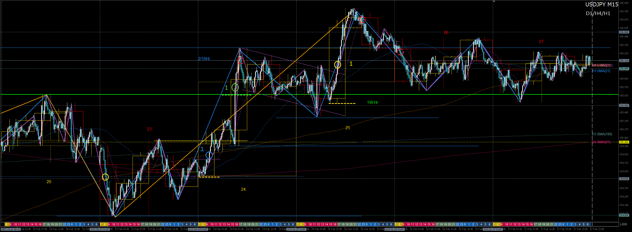 1. 先週高値の上値更新失敗→155円レジスタンスでショート