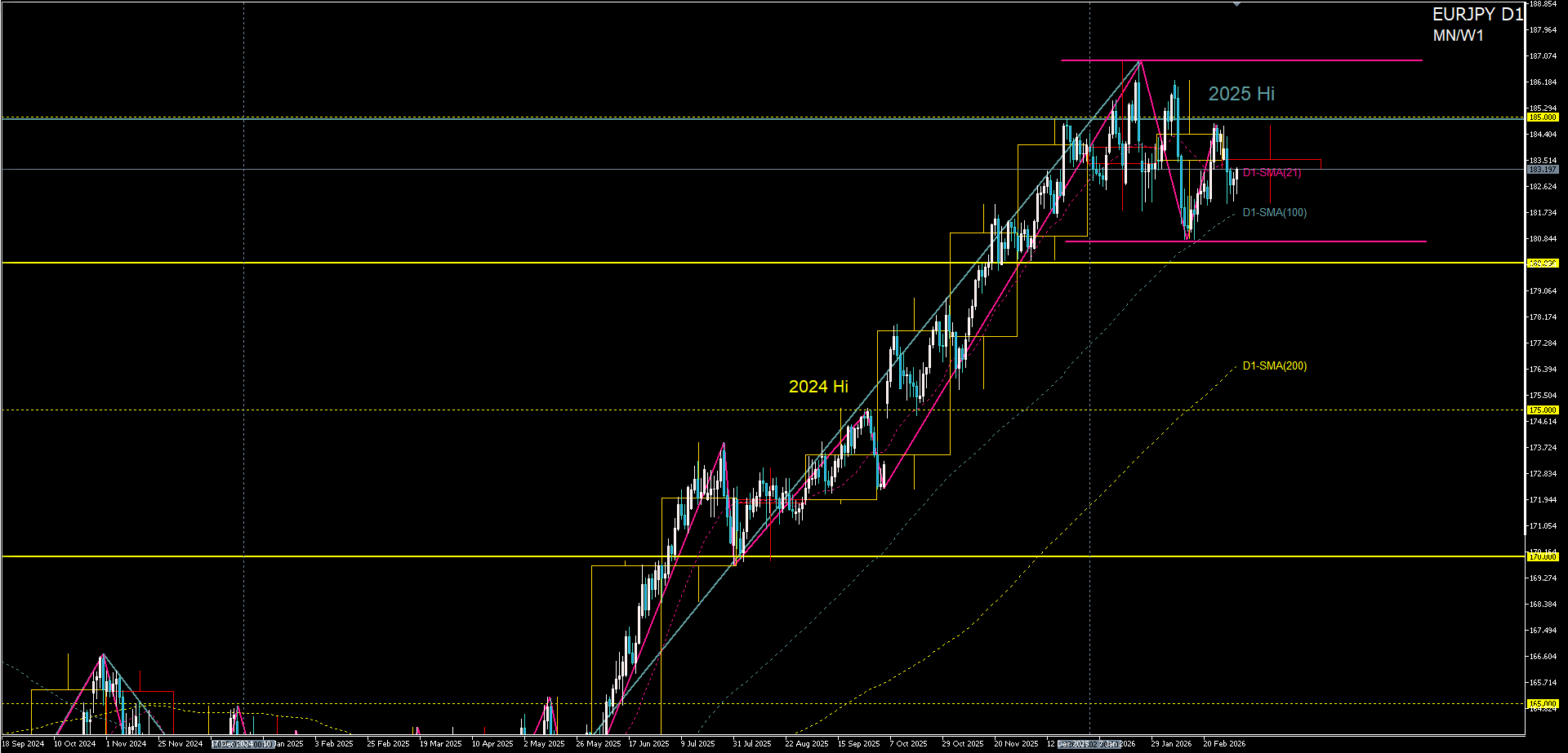 - ただし、高値圏では1月高値 → 2月高値 → 先週高値と高値切り下げの流れも見えています。