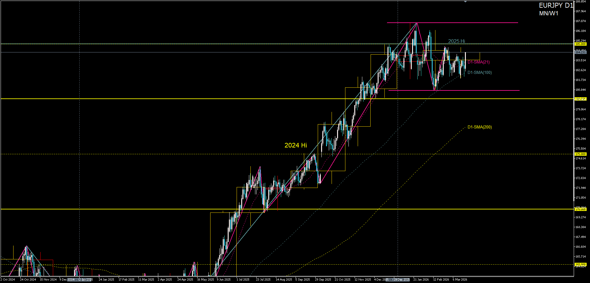 ユーロ円は“結果として作られる通貨ペア”であるため、主導通貨の影響を強く受けるため、「君子危うきに近寄らず」で様子見が最適解といえます。