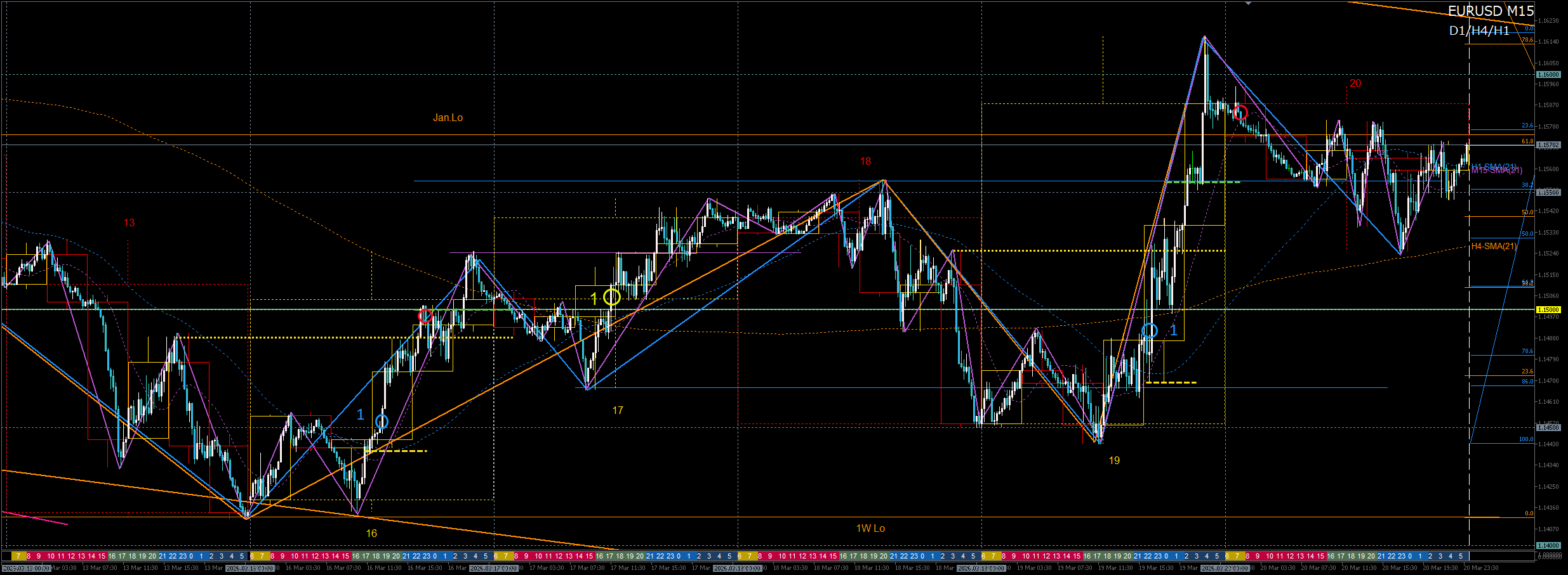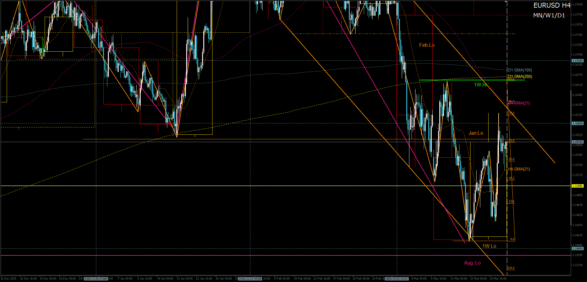 週末は、H4ラス押し安値+D1-SMA21が意識されて大きく戻す。