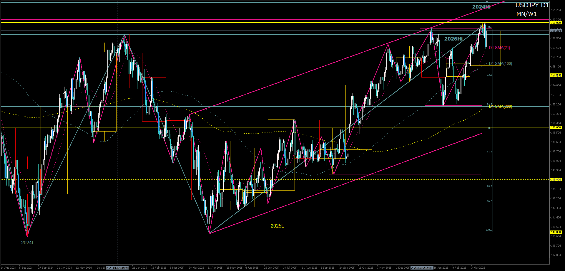 - 160円付近で、M15高値切り下げや強い反発などが出れば、2025年高値へ向けた利確調整を狙って短期逆張りショート。