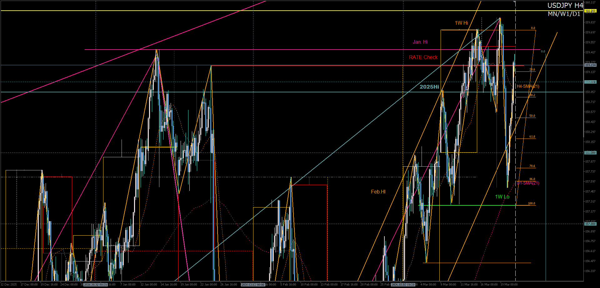 - H4大構造:H4上昇トレンド vs 160円の心理的節目